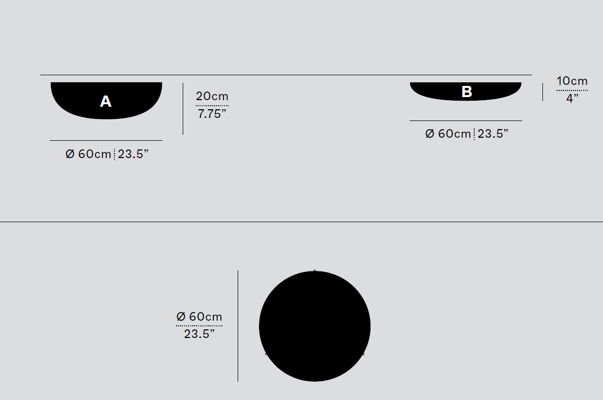 Настенно-потолочная серия Iris доступна в двух диаметрах 60 и 90 см, в двух абажурах большего (А) и меньшего (В) объема, а также в двух отделках фурнитуры (черный, серебристый).
