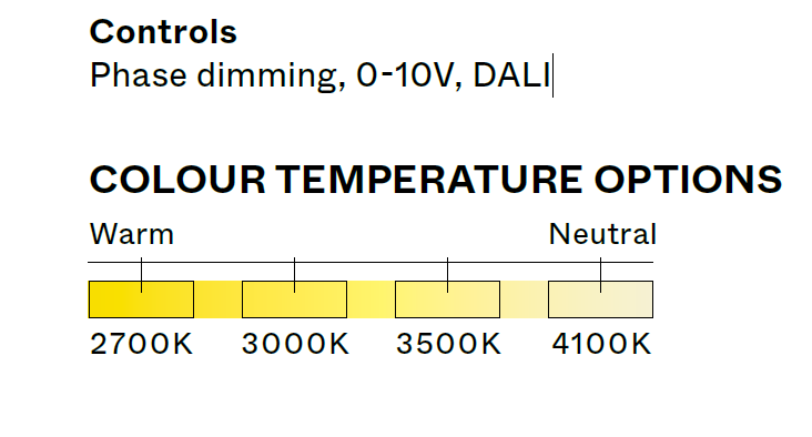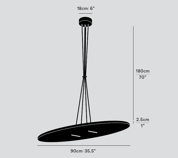 Высота подвеса 180см регулируется, с возможностью кастомизации по запросу. На выбор представлены четыре цветовые температуры 2700K, 3000K, 3500K, 4100K, а также различные отделки (черный, белый, бронзовый, золотой) и два универсальных диаметра 60 и 90 см. Доступна поддержка фазового диммирования, протоколов 0-10V и DALI.