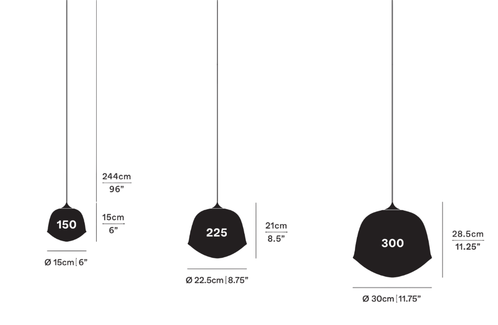 Серия представлена в трех базовых диаметрах 150, 225 и 300 мм, и трех отделках — коричневый цитрин, серый сланец и белый перламутр, которые комплектуются соответствующей однотонной фурнитурой.