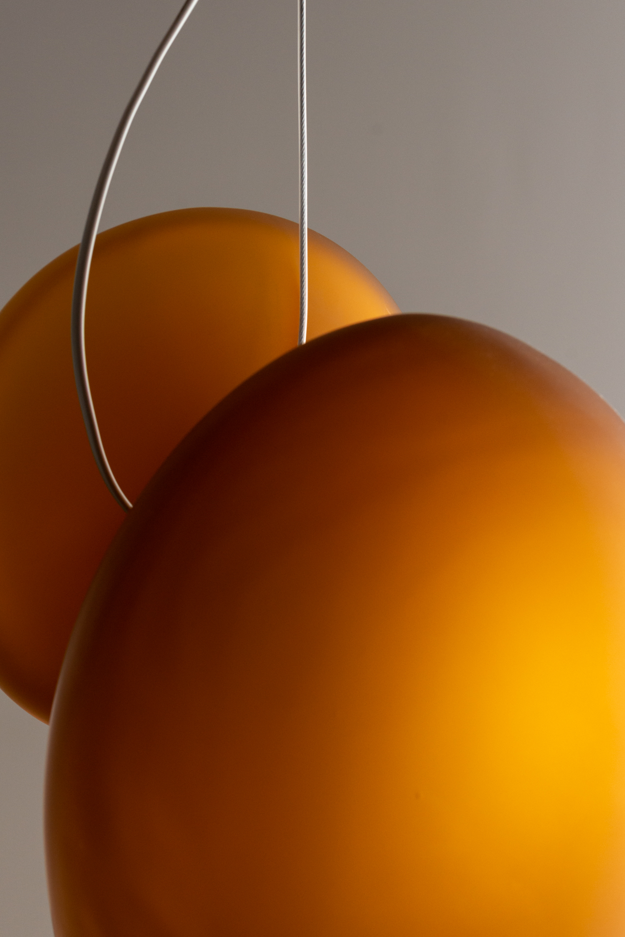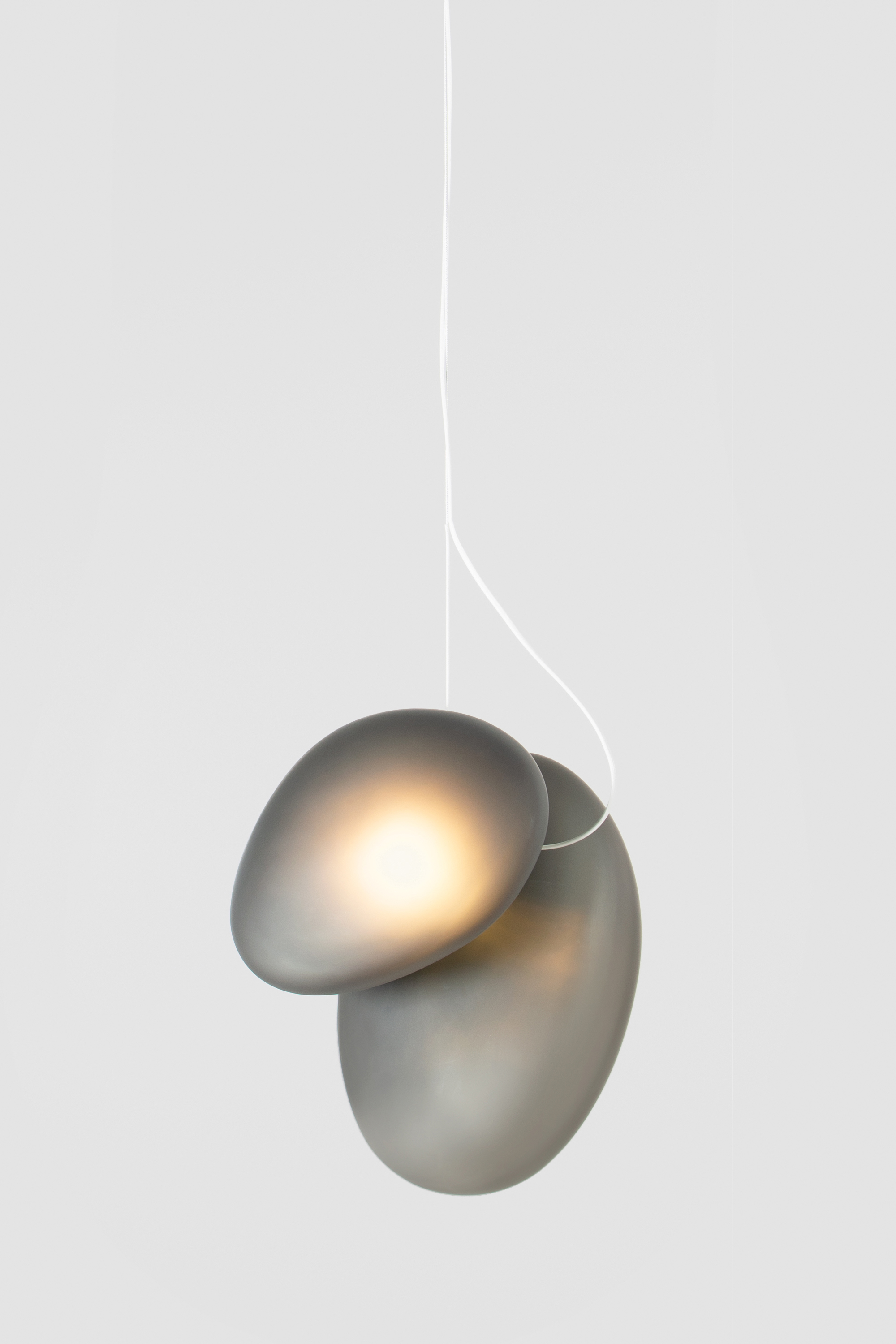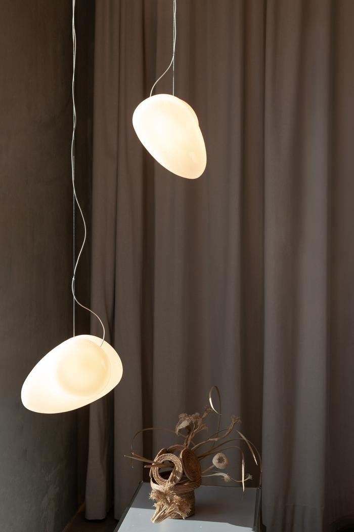 Серия Pebble вдохновлена природной красотой камней в их простом, но скульптурном облике, воплощенном в полупрозрачном абажуре из выдувного стекла. Подвесной светильник, созданный на контрасте и в диалоге двух форм — большой и малой — дарит ощущение динамического света, переменчивого света и множественных образов, которые мы наблюдаем при взгляде с разных ракурсов.