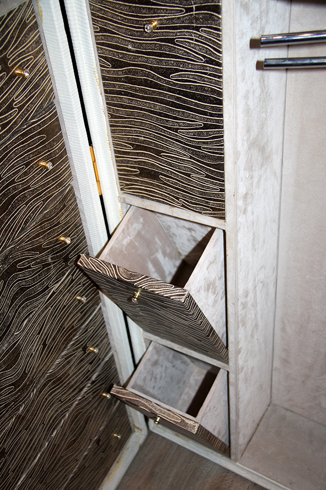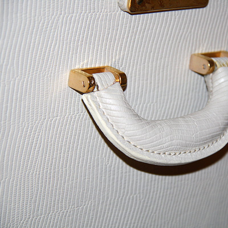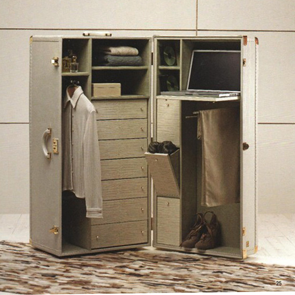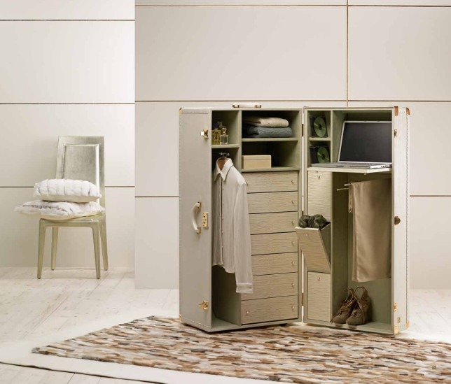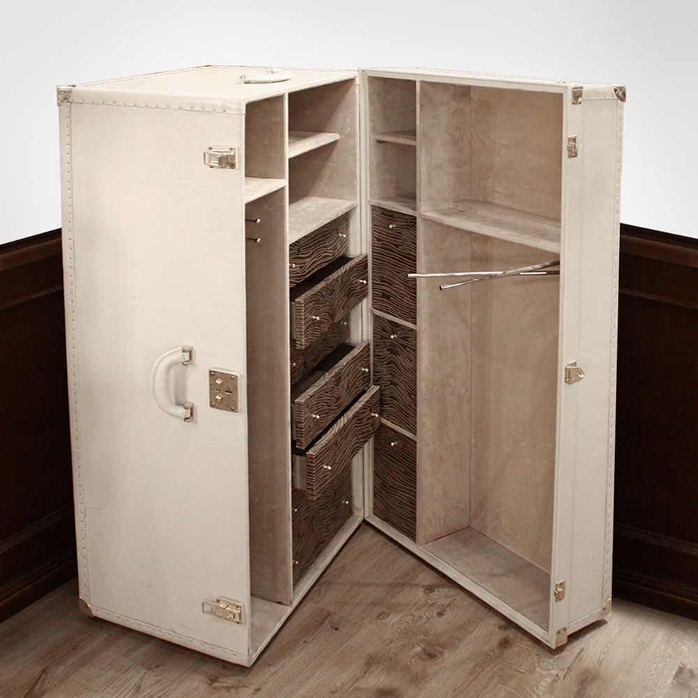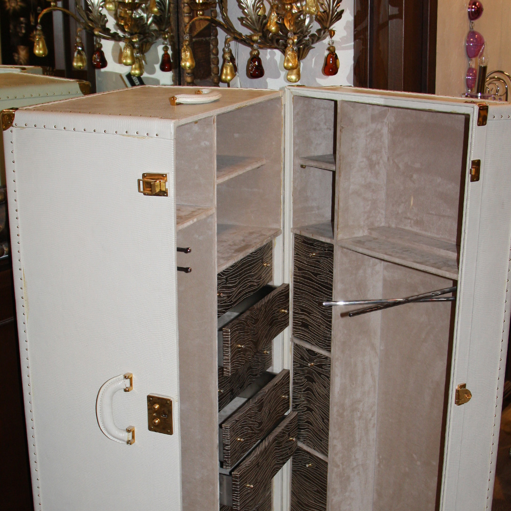 Чемодан-шкаф из коллекции ABANTE выполнен из кожи белого цвета. Чемодан очень функциональный, оснащен выдвижными ящичками, вешалками, полками. Ящики выпонены из дерева бежево-коричневого цвета.