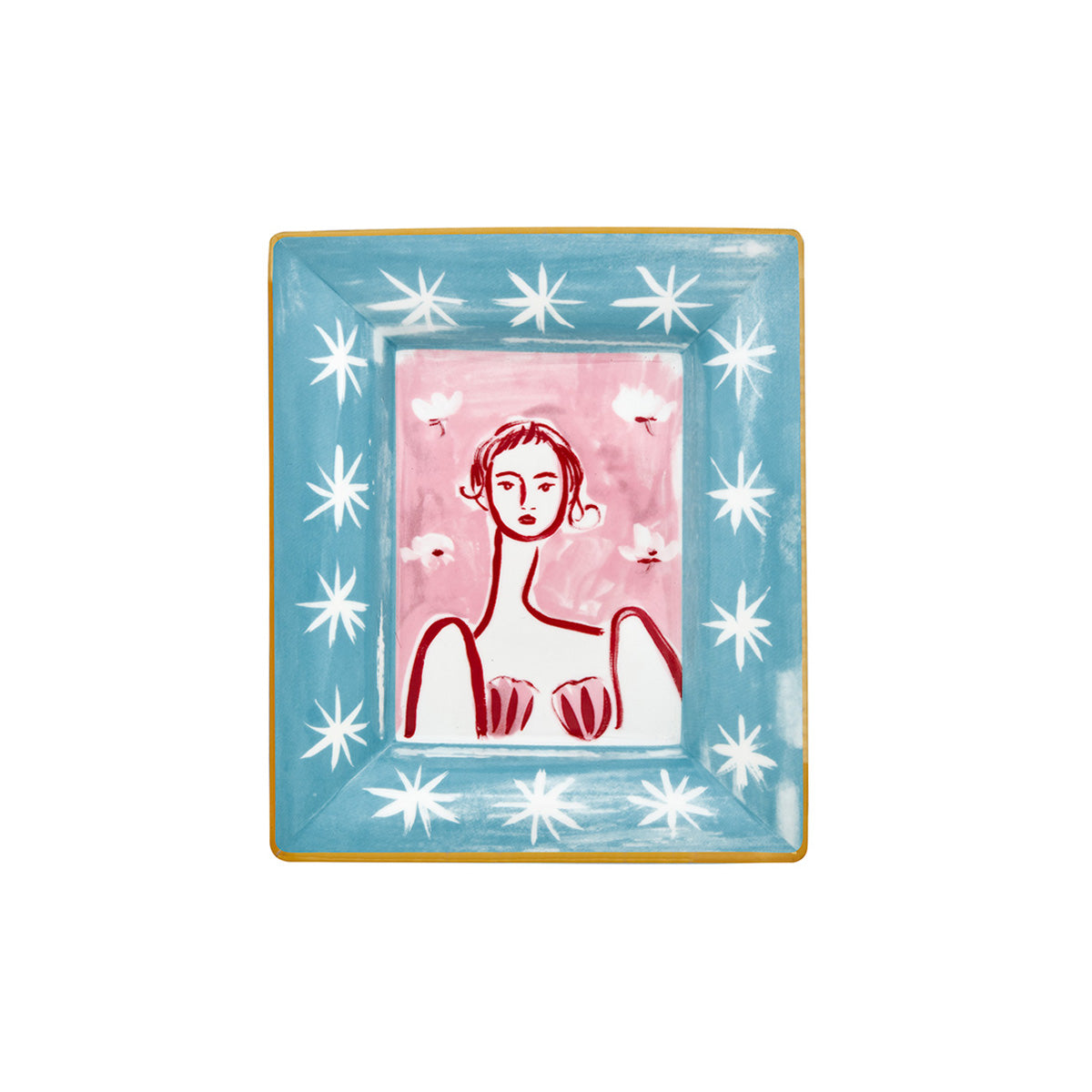 Поднос Bitossi Home Donna. Прямоугольный фарфоровый поднос Dama из коллекции Con Amore — настоящее произведение декоративного искусства, граничащее между функциональным предметом и камерной картиной. Выполненный в стиле «наивной» живописи свободными экспрессивными линиями, центральный женский образ на пастельно-розовом фоне в обрамлении небесно-голубого создает романтичную атмосферу. Глубокие винные оттенки в контурах фигуры добавляют глубины и графичности. Ритмичный узор из белых звезд придает изделию сказочный, почти фольклорный характер, превращая его в предмет с историей. Закрепить на стене как декоративное панно, хранить изысканные украшения или приятные мелочи, со вкусом подать завтрак — все в воле Вашей фантазии! Подходит для посудомоечной машины до 250 циклов, не подходит для микроволновой печи. Дизайн: Chiara Perano.