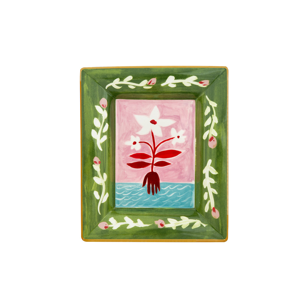 Поднос Bitossi Home Fiori bianchi. Прямоугольный фарфоровый поднос Fiori Bianchi из коллекции Con Amore — образец современного функционального декора с сюрреалистичным художественным сюжетом. Его дизайн напоминает декорацию к сказке с природными мотивами и символизмом. Многослойная композиция выполнена в технике ручной живописи видимыми мазками: фантазийный белый цветок на насыщенно-красном стебле, уходящем в голубые волны, создает гармонию земли, воды и воздуха. Широкие травянисто-зеленые борта с бело-розовым узором контрастируют с основным сюжетом, придавая подносу особую глубину и объем. Тонкая золотистая кайма подчеркивает строгую геометрию, смягчая общую «наивную» эстетику. Подходит для посудомоечной машины до 250 циклов, не подходит для микроволновой печи. Дизайн: Chiara Perano.