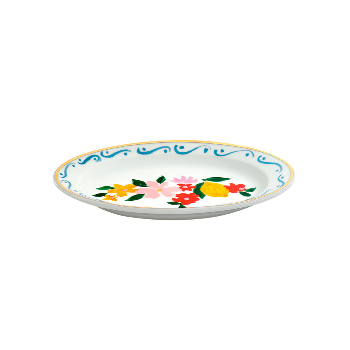 Поднос Bitossi Home Fiore e Limoni. Классический овальный поднос Fiore e Limoni («Цветы и лимоны») из коллекции Con Amore —концентрированное лето, застывшее в фарфоре. Его дизайн напоминает о залитых солнцем террасах Амальфитанского побережья и беззаботных завтраках под открытым небом. Техника свободных мазков задает ретро-мотив в яркой тональности: сочный лимон соседствует с пышными садовыми цветами, а игривый ярко-голубой орнамент, напоминающий морские волны или традиционные средиземноморские изразцы, завершает композицию. Тонкая золотая кайма добавляет благородного сияния и аристократичности. Подходит для посудомоечной машины до 250 циклов, не подходит для микроволновой печи. Дизайн: Chiara Perano.