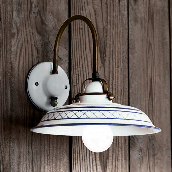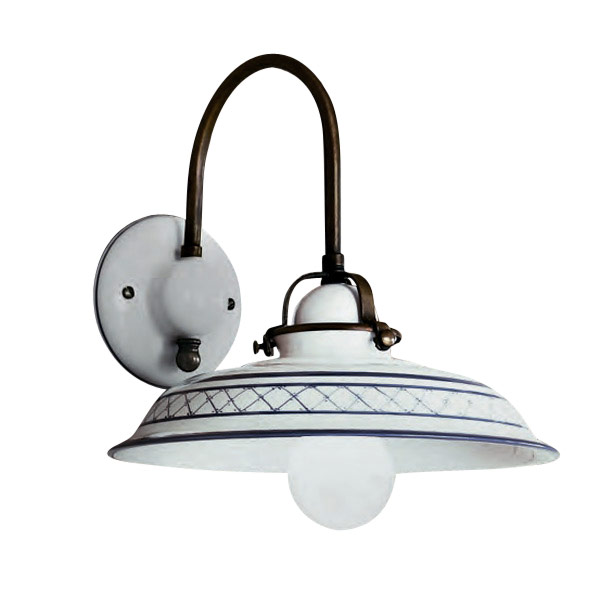 Настенный уличный светильник из коллекции Provenza выполнен из керамики, окрашеной в белый цвет с коричневой арматурой. Рисунок в виде орнамента синего цвета.