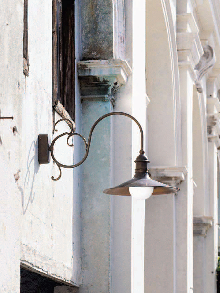 Настенный уличный светильник из коллекции Gherla выполнен из металла бронзового цвета с патиной.