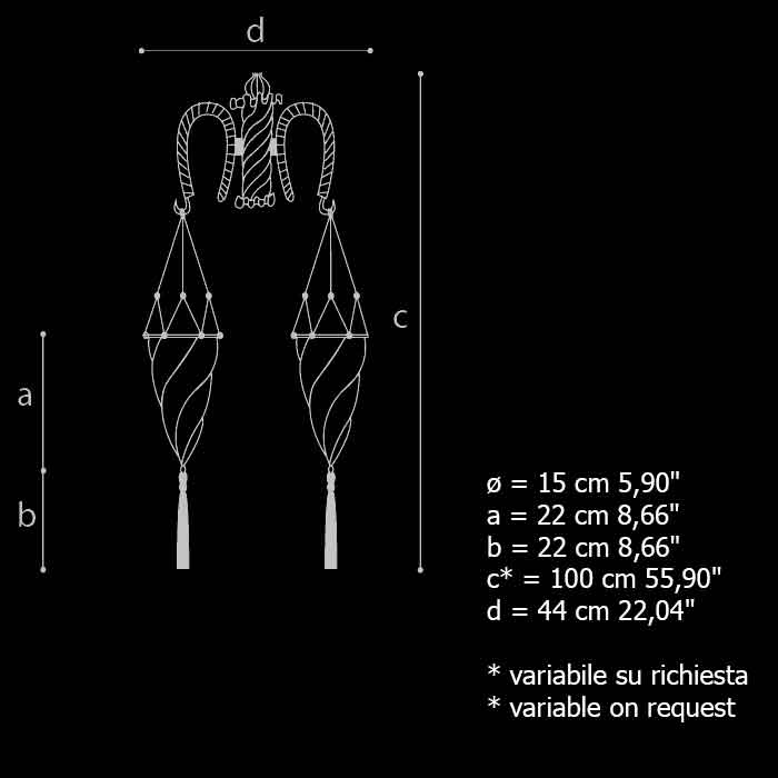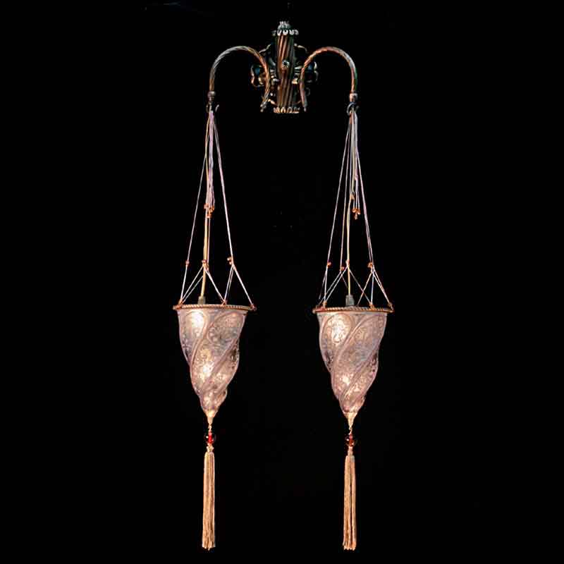 Двойное бра конической формы в восточном стиле. Два плафона крепятся к настенной арматуре на тросиках и шелковых подвесах. Высота регулируется. Материал светильников — муранское стекло бежевого цвета, с расписными узорами, в металлической оправе золотистого цвета. Декор — шелковые кисти со стеклянными бусинами. Под заказ возможны другие варианты цвета стекла (как на фото).