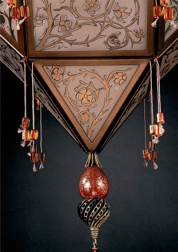 Подвесной светильник в восточном стиле выполнен из муранского стекла, с расписными узорами бежевого цвета. Светильник в форме многогранника (грани в металлических рамках), крепится к основанию потолка на тросиках. Высота регулируется. Декор —шелковая кисть и нити со стеклянными бусинами. Под заказ возможны другие варианты цвета стекла (как на фото).