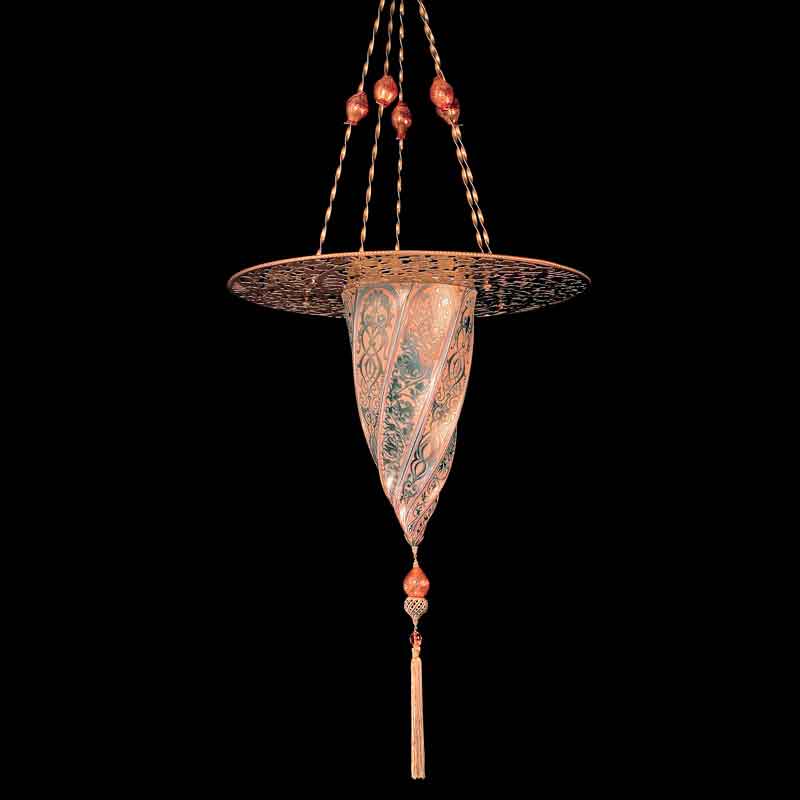 Изысканный подвесной светильник конической формы в восточном стиле. Материал светильника — муранское стекло бежевого цвета, украшено расписными узорами. Плафон закреплен на металлической перфорированной окружности. Светильник крепится на металлической цепи, декорирован шелковой кисточкой со стеклянной бусиной. Высота регулируется. Под заказ возможны другие варианты цвета стекла (как на фото).