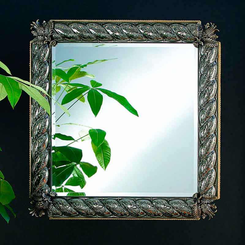 Квадратное зеркало, с рельефной рамкой из муранского стекла глянцевого каштанового цвета (возможен другой вариант цвета рамки - матовый каштановый как на фото). Рамка украшена расписными узорами. Декор — металлические цветы и листья и тонкая металлическая обрамляющая оправа золотистого цвета.