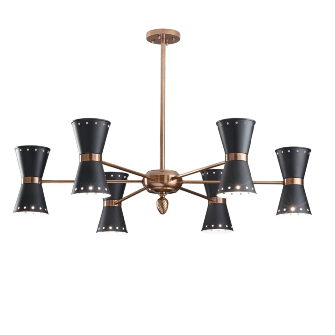 Коллекция 3010/12 выполнена из латуни с металлическими абажурами, близкими по форме к песочным часам, с небольшими декоративными отверстиями. Эффектная люстра 3010/12 представлена в отделке «античная бронза» с шестью черными абажурами, скрывающими по два источника света вверх-вниз и контрастную белоснежную внутреннюю отделку. Элегантный потолочный светильник 3010/12 гармонично дополнит интерьер гостиной или холла, добавив пространству ноту респектабельности и сдержанной роскоши. Подойдет для частных или коммерческих пространств.
