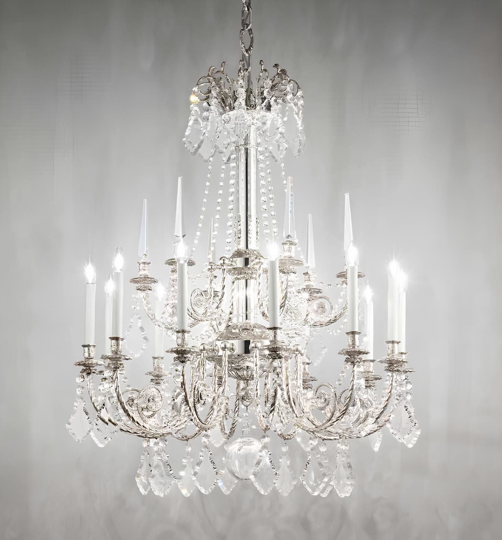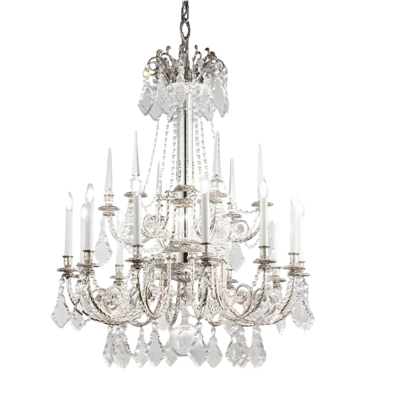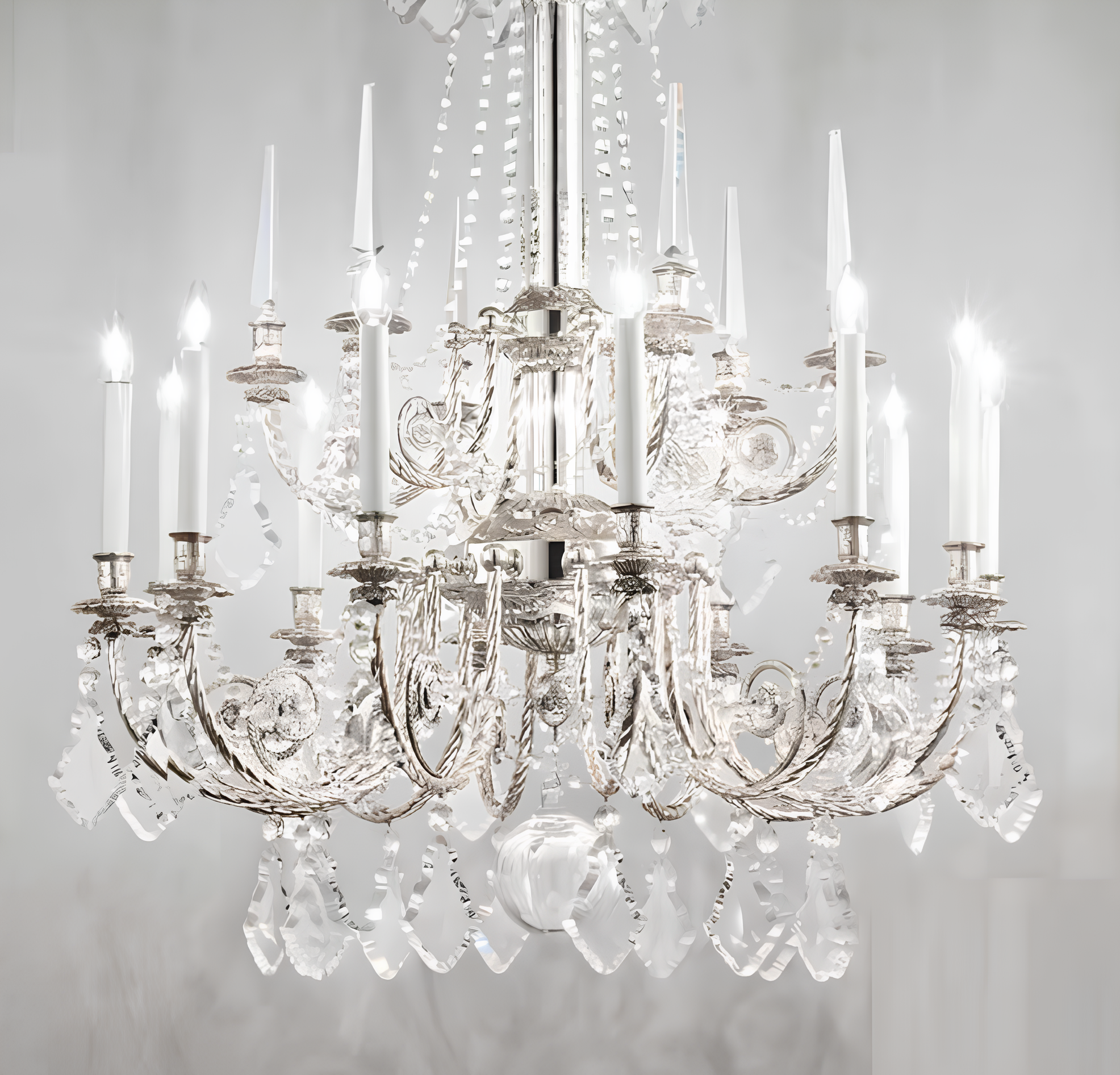 По-королевски щедрая красотой и изяществом двухъярусная 12-ти-рожковая люстра 782/12 от Arizzi выполнена ремесленным методом латунного литья в песчаные формы, с отделкой под старинное серебро. Подвесной декор выполнен из прозрачного богемского хрусталя.