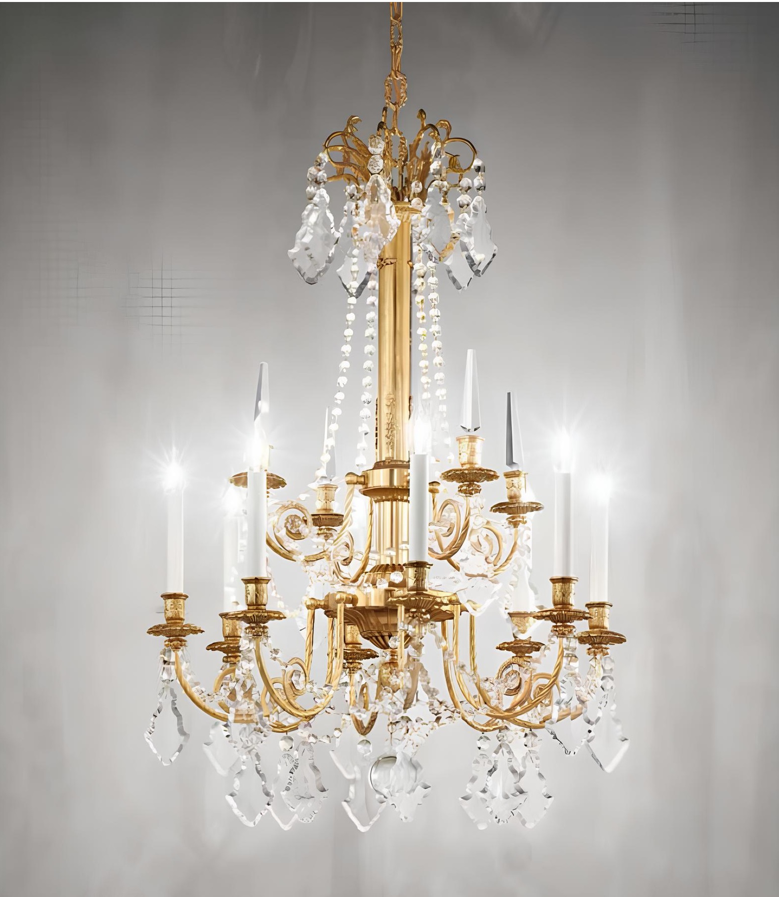 Стройная и элегантная двухъярусная восьмирожковая люстра серии 782 от Arizzi выполнена традиционным ремесленным методом латунного литья в песчаные формы, с отделкой под старинное французское золото. Подвесной декор из прозрачного богемского хрусталя.