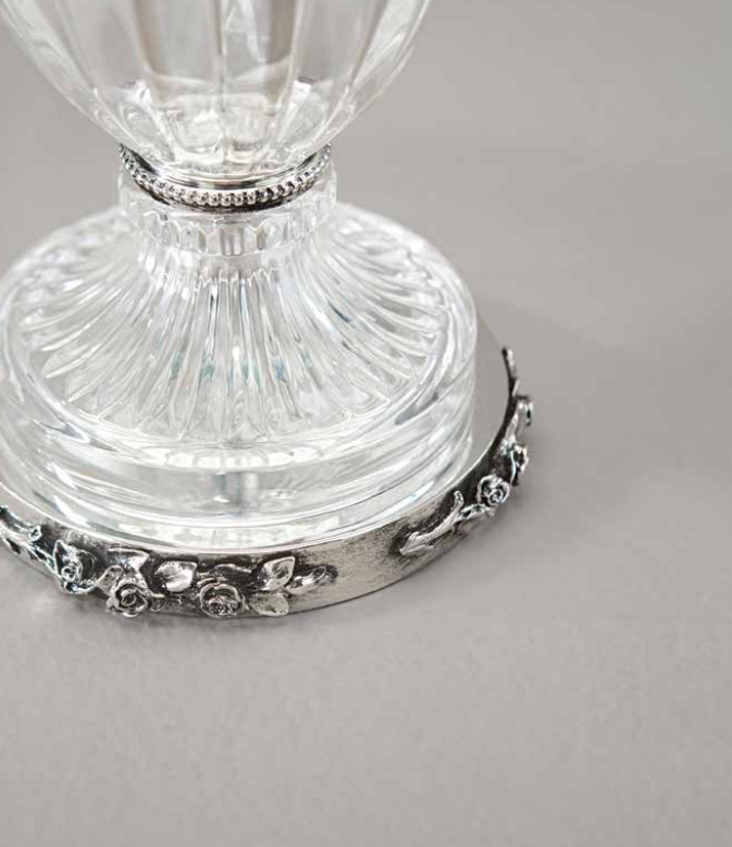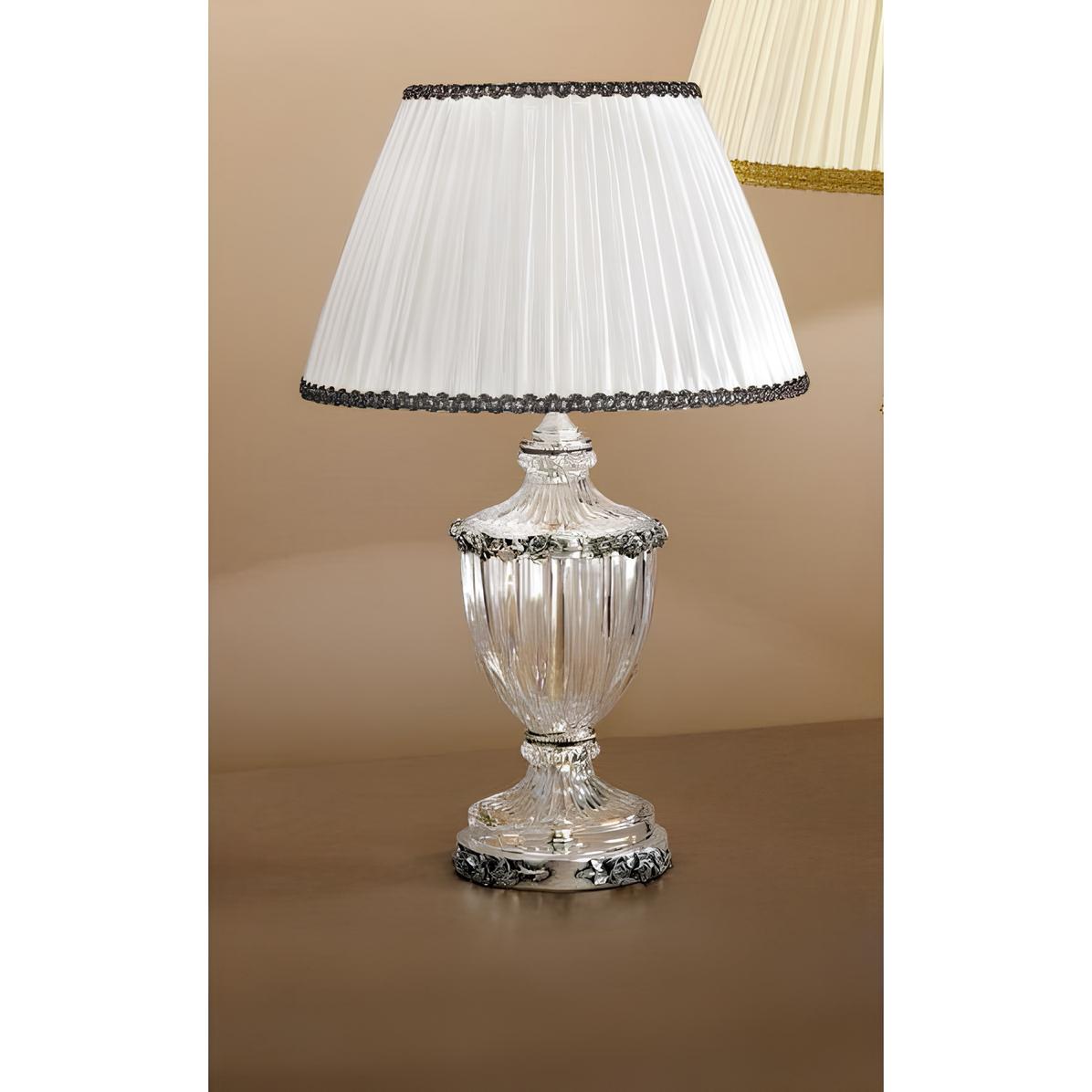 Классическая настольная лампа из латуни с литыми деталями, филигранной отделкой под старинное серебро, хрусталь ручной огранки. Абажур из белой плиссированной ткани. Лаконичный, завораживающий неоклассической эстетикой настольный светильник как изысканное украшение интерьера Вашей спальни, гостиной, кабинета или библиотеки.
