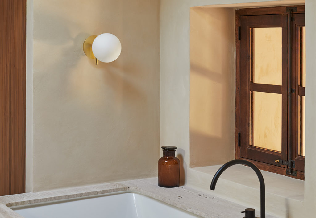Настенный светильник Aromas Del Campo из коллекции Atom с арматурой из металла золотого цвета и круглым плафоном из опалового стекла.