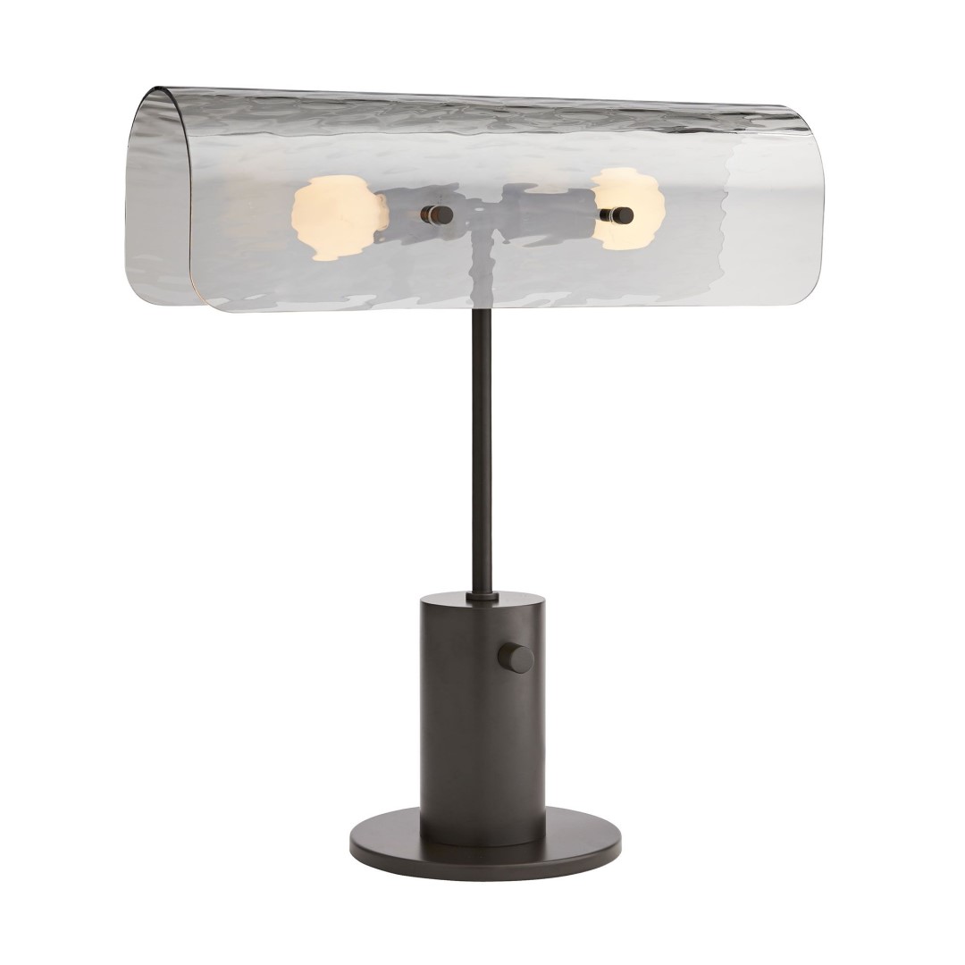 Настольная лампа Arteriors Bend представляет собой новую интерпретацию классической библиотечной лампы с плафоном из дымчатого стекла в форме полуцилиндра и современным основанием из черненой стали. Доступен в серебристо-сером дымчатом или теплом янтарном стекле.