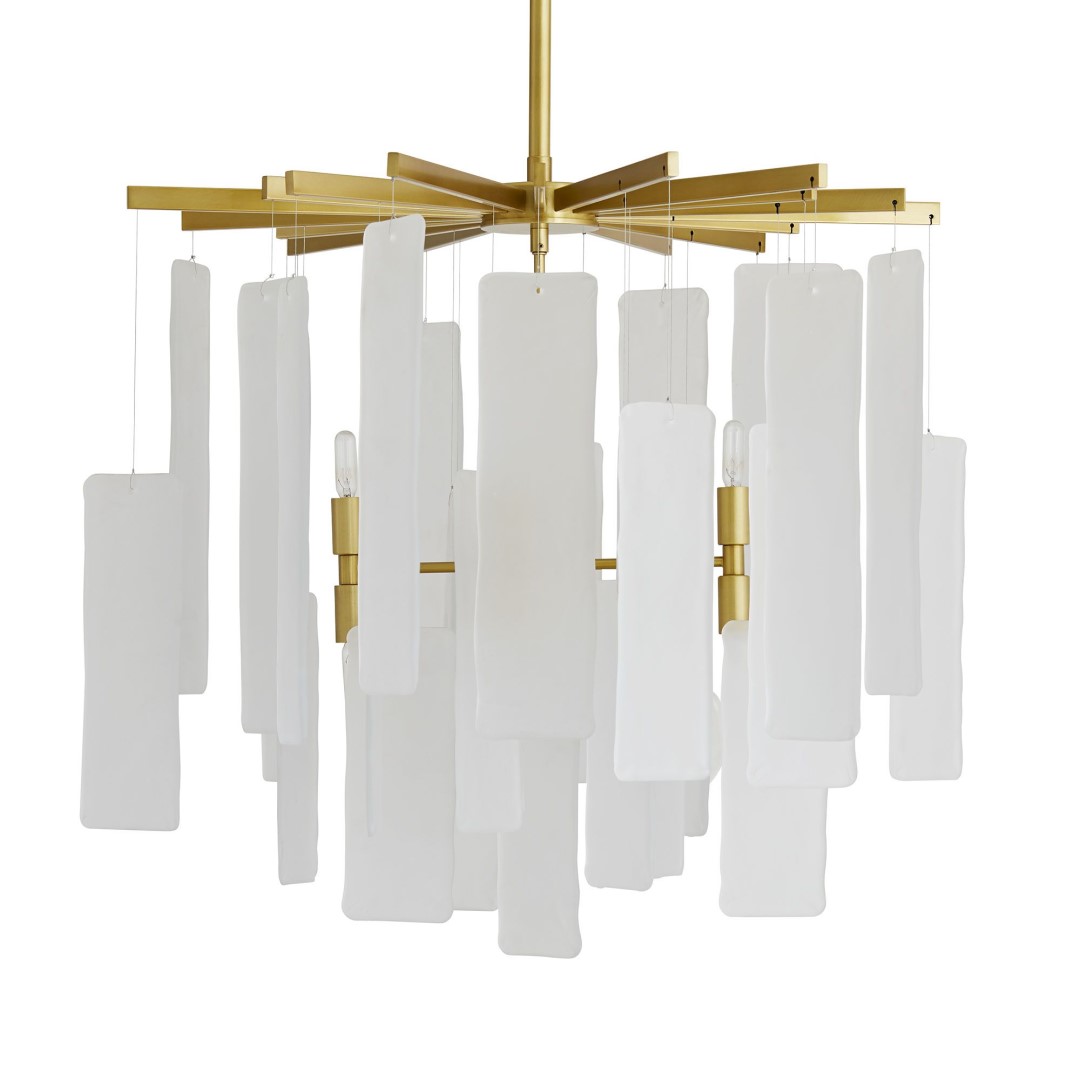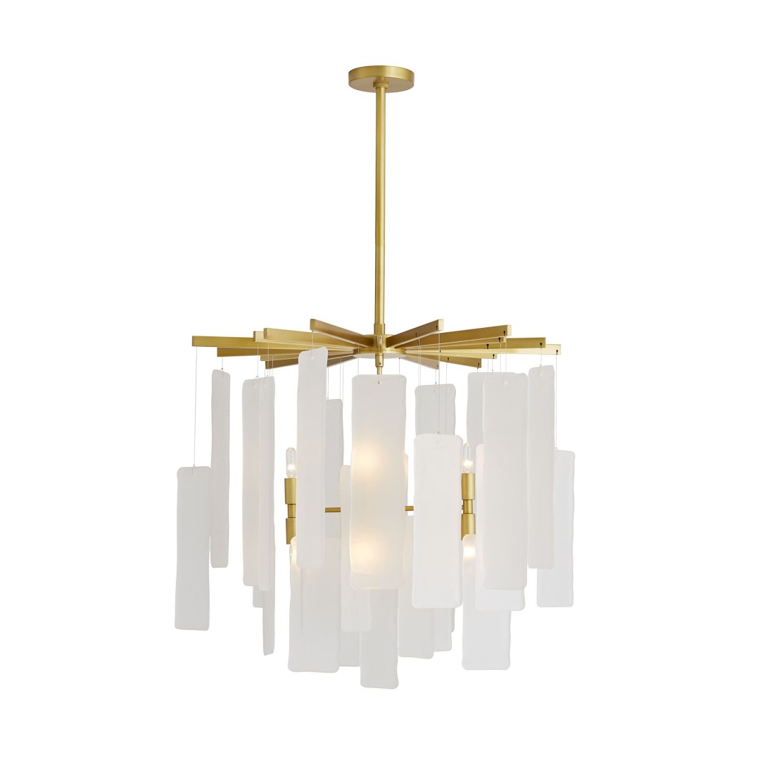 Люстра Arteriors Harriet Frosted. Гладкая и тонкая основа из стали латунного цвета, к которой крепятся пластины из матового белого стекла, Пластины мягко затемняют и фильтруют свет от восьми блестящих лампочек.