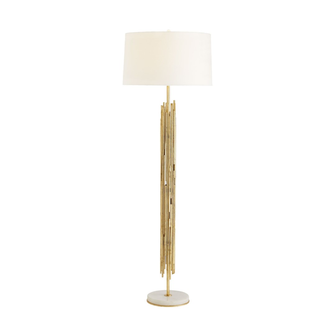 Торшер Arteriors Prescott Gold Leaf. Отдельные железные стержни сварены вместе и вручную покрыты сусальным золотом. Основание из белого мрамора, плафон из белого льняного полотна с белой хлопковой подкладкой.