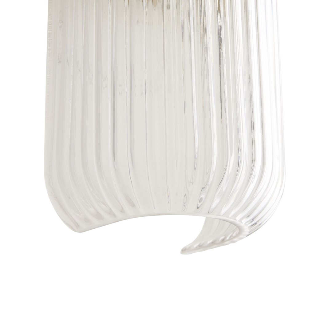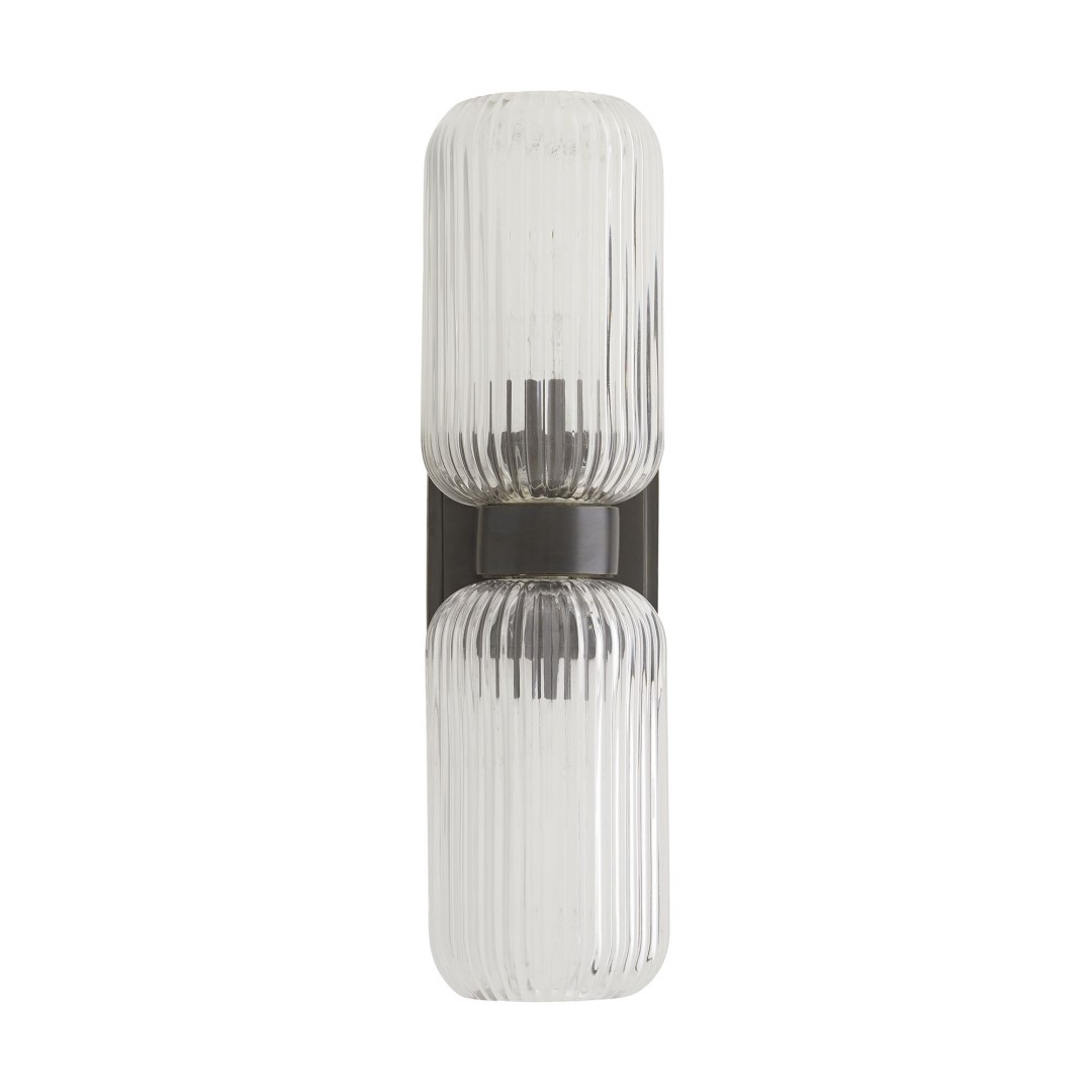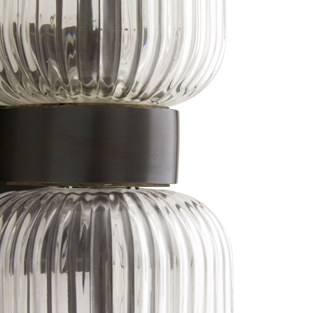 Настенный светильник Arteriors Tamber. Прозрачные рифленые стеклянные плафоны с бронзовым поясом, который подчеркивает форму и добавляет полированный элемент к их текстурированной форме. Простой и изысканный, этот универсальный светильник подходит практически для любого стиля.