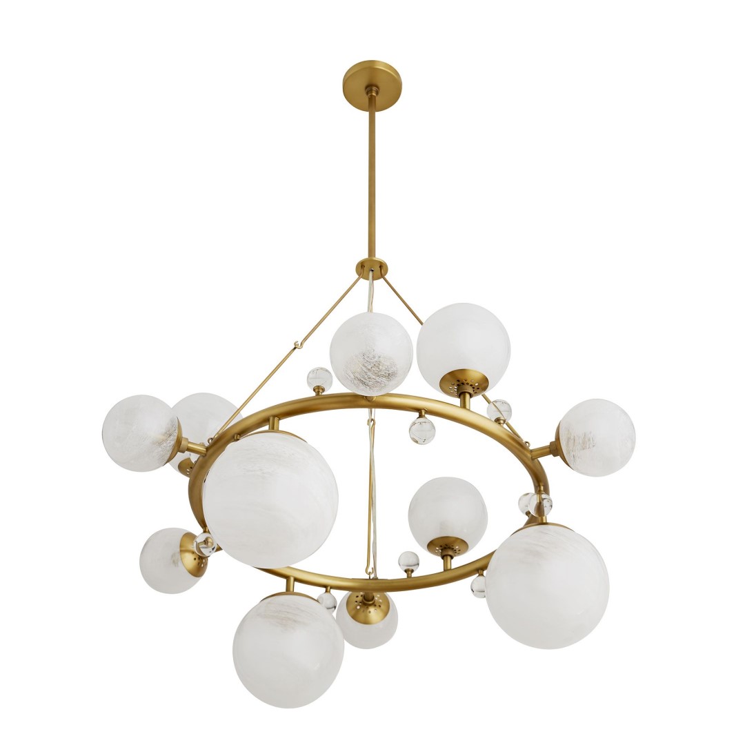 Люстра Arteriors Troon Round Antique Brass.Опаловые вихревые стеклянные шары разного размера украшают гладкую и тонкую круглую стальную раму. Маленькие шарики из прозрачного хрусталя красиво контрастируют с античной латунной отделкой