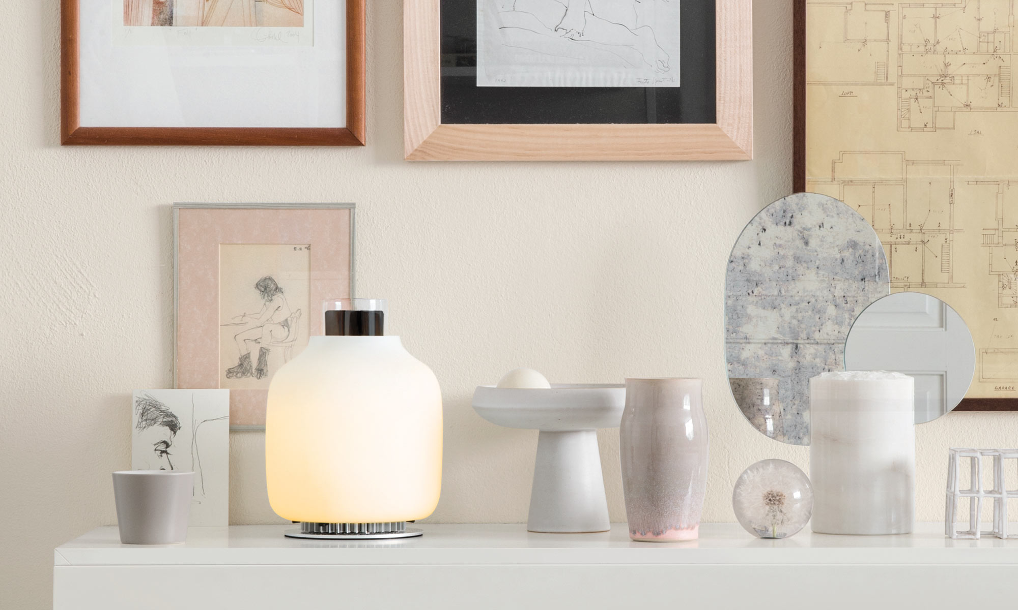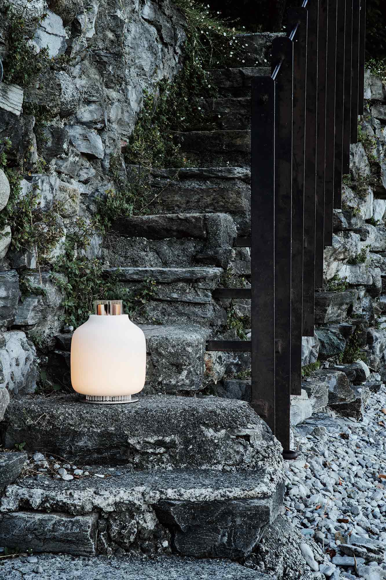 Настольная лампа Astep Candela из опалового стекла и алюминия. Candela вырабатывает собственное электричество, позволяя заряжать мобильные устройства через USB-кабель. Она легко зажигается спичкой или зажигалкой; полный бак содержит 300 мл биоэтанола, достаточного для пяти часов использования. Благодаря встроенной батарее, которая заряжается при наличии пламени, Candela может заряжать мобильные телефоны и планшеты даже при выключенном питании.