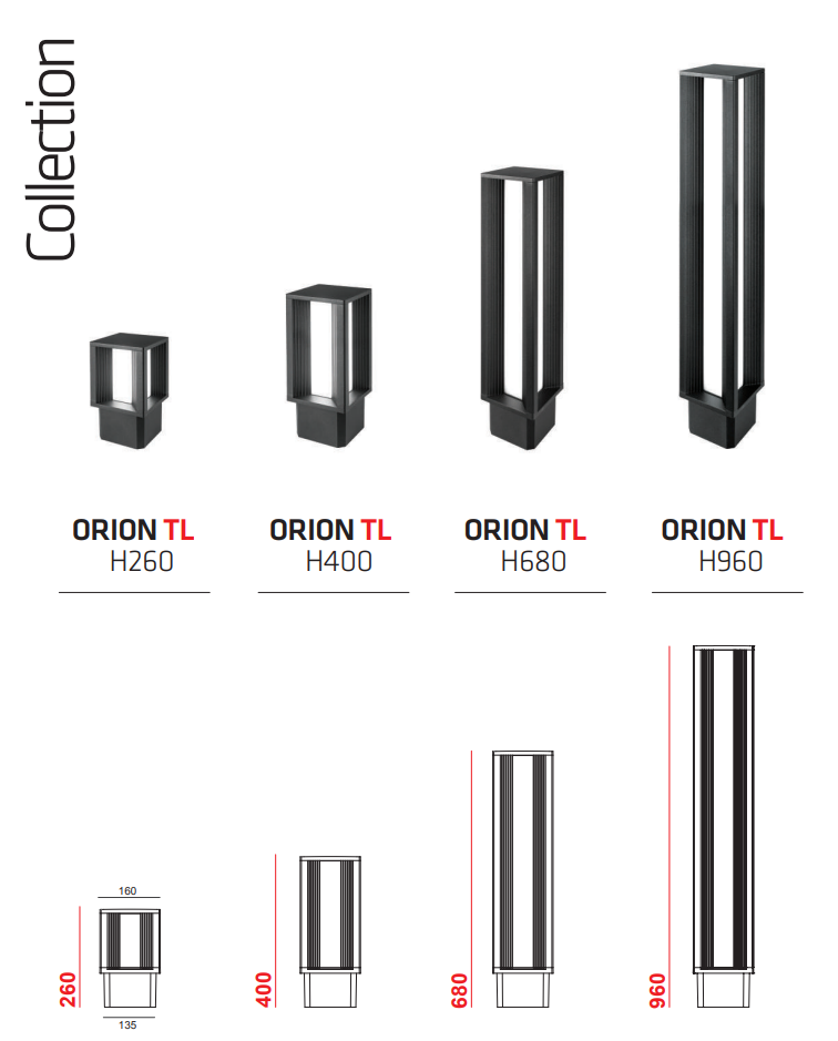 Линейка светильников Orion TL предлагает болларды высотой 260, 400, 680 и 960 см с засветкой по одной, двум или четырем сторонам. Под заказ возможна покраска в любой цвет из каталога RAL. Цветовая температура 2700К, 3000К или 4000К, драйвер c управлением on/off или DALI.