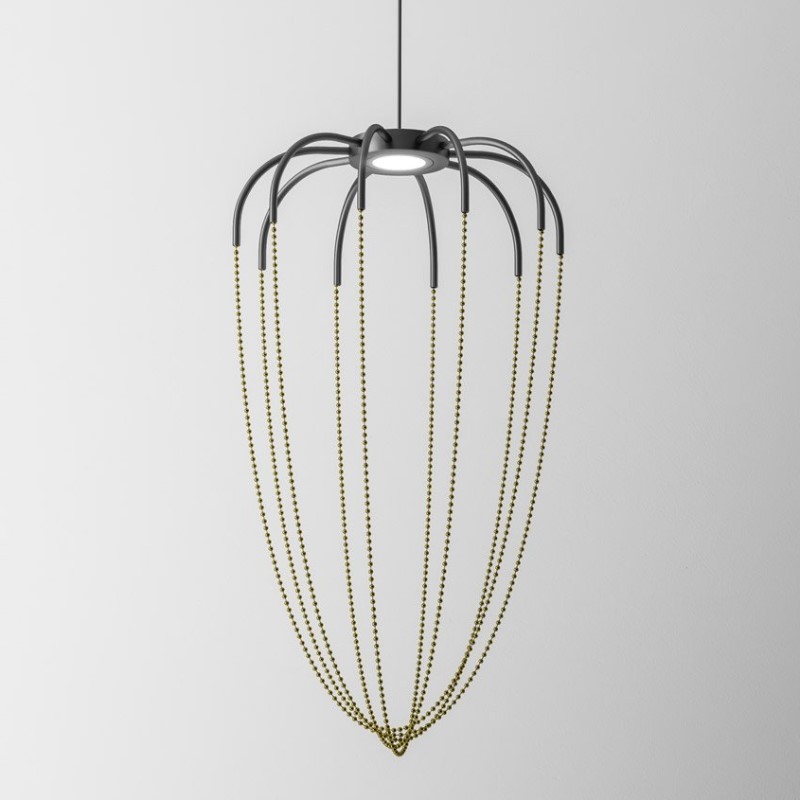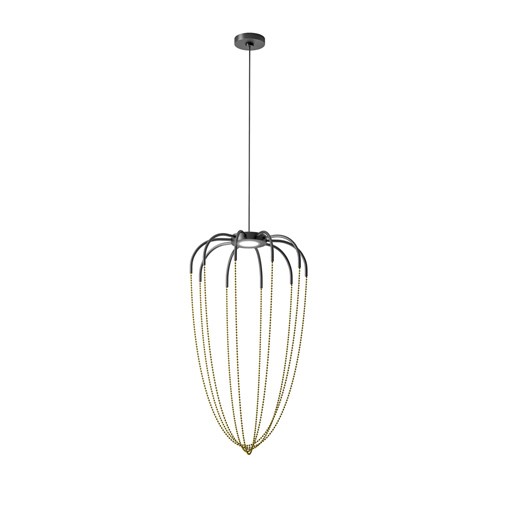 Подвесной светильник Axo Light из коллекции Alysoid из металла антрацитово-серого и латунного цвета. Каркас модели расходится тонкими лучами от центра, переходя из жестких направляющих в элегантные цепи. Отсутствие выраженного декора подчеркивает универсальность светильника.Светодиод с регулируемой яркостью. Длина подвеса регулируется, макс.300см.