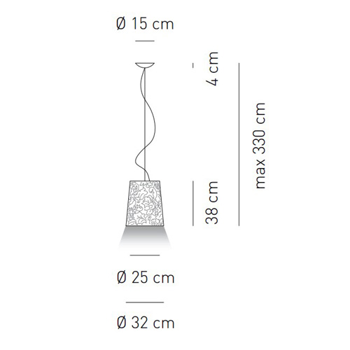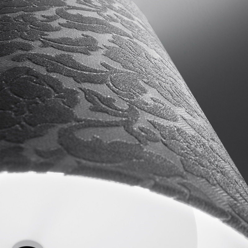 Подвесной светильник из коллекции Damasco. Абажур серого цвета покрыт дамасской тканью, пропитанной антипиреном. В коллекции два цвета: слоновая кость и серый. Размеры абажуров варьируются от 30 см до 90 см в диаметре. Также доступны модели с лампами накаливания или люминесцентными лампами.