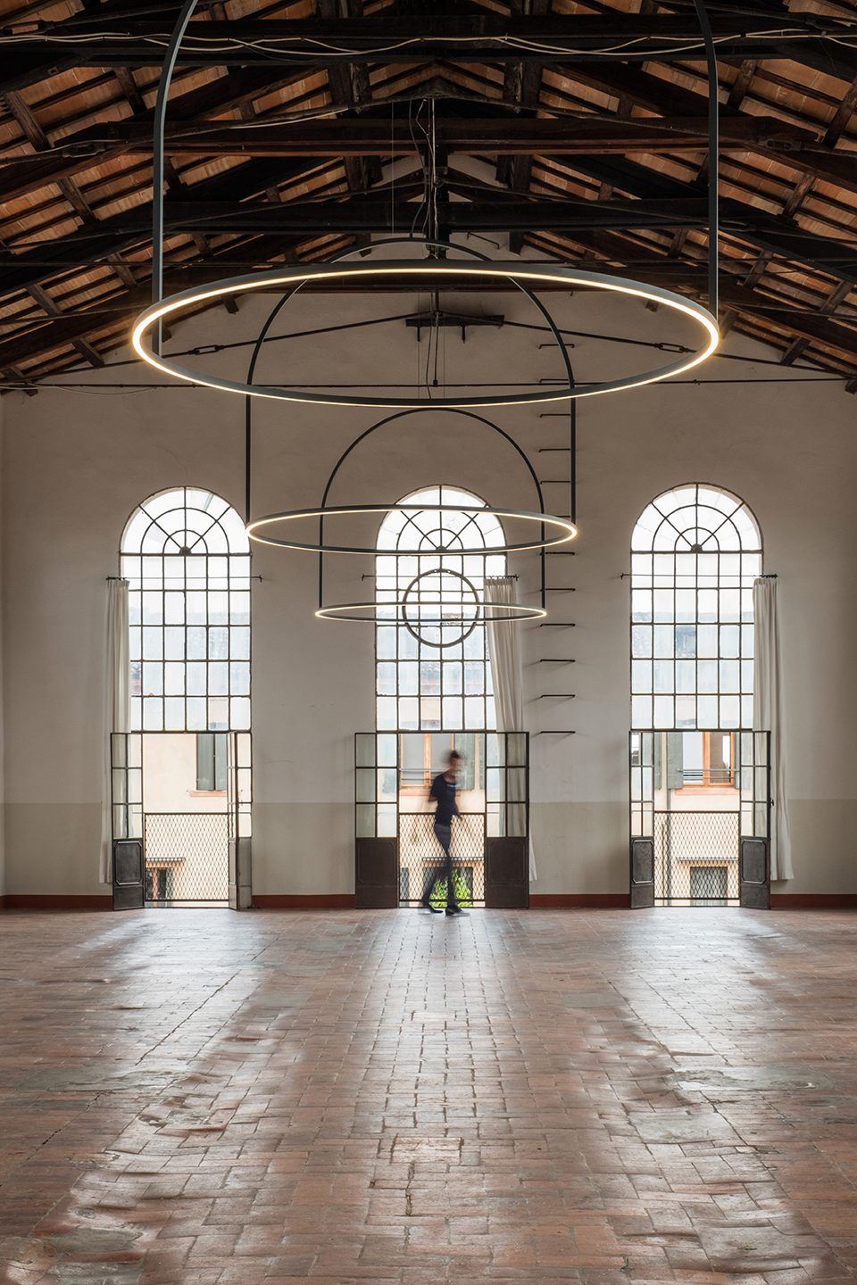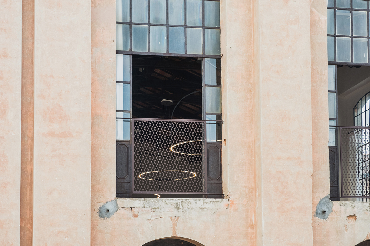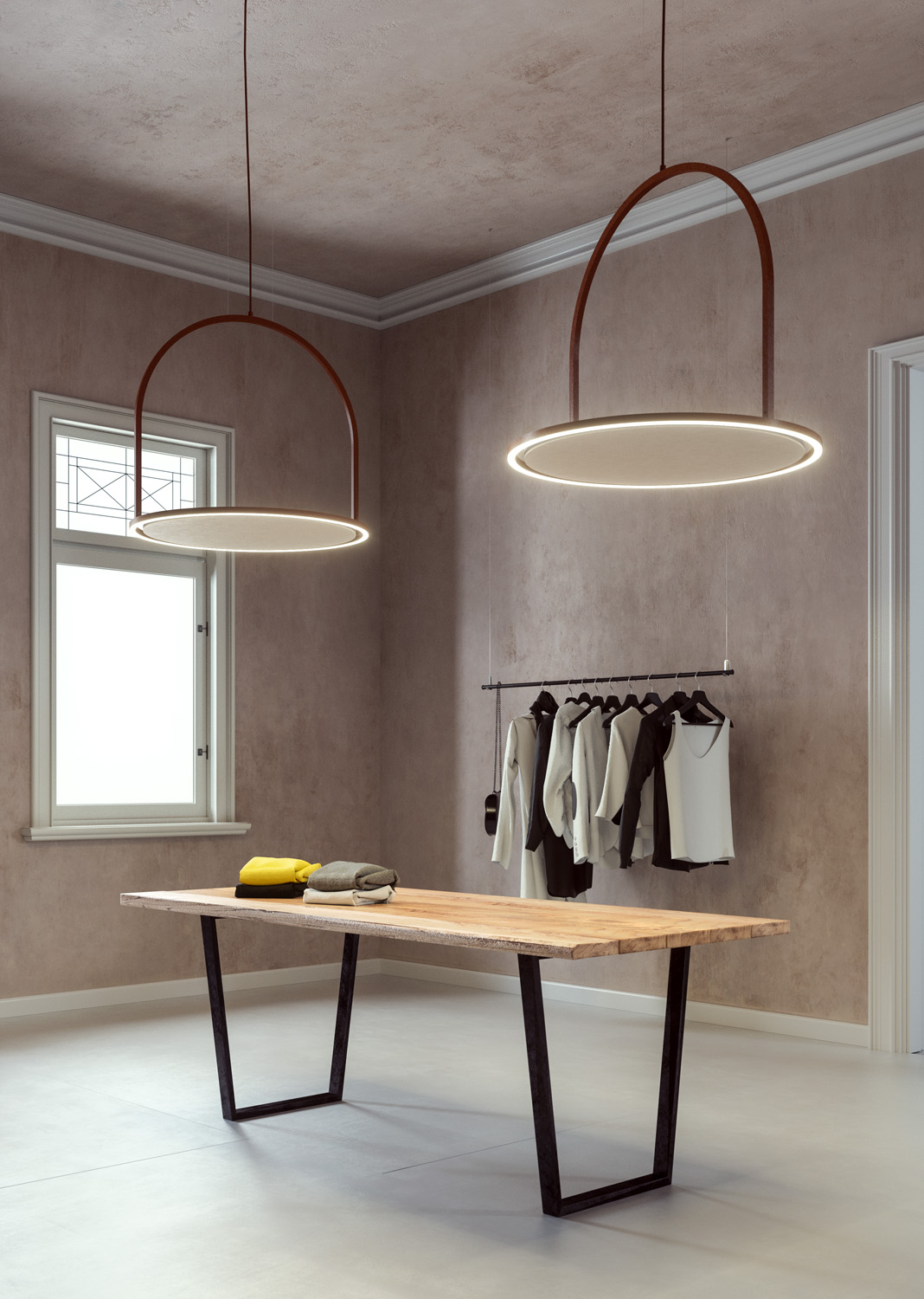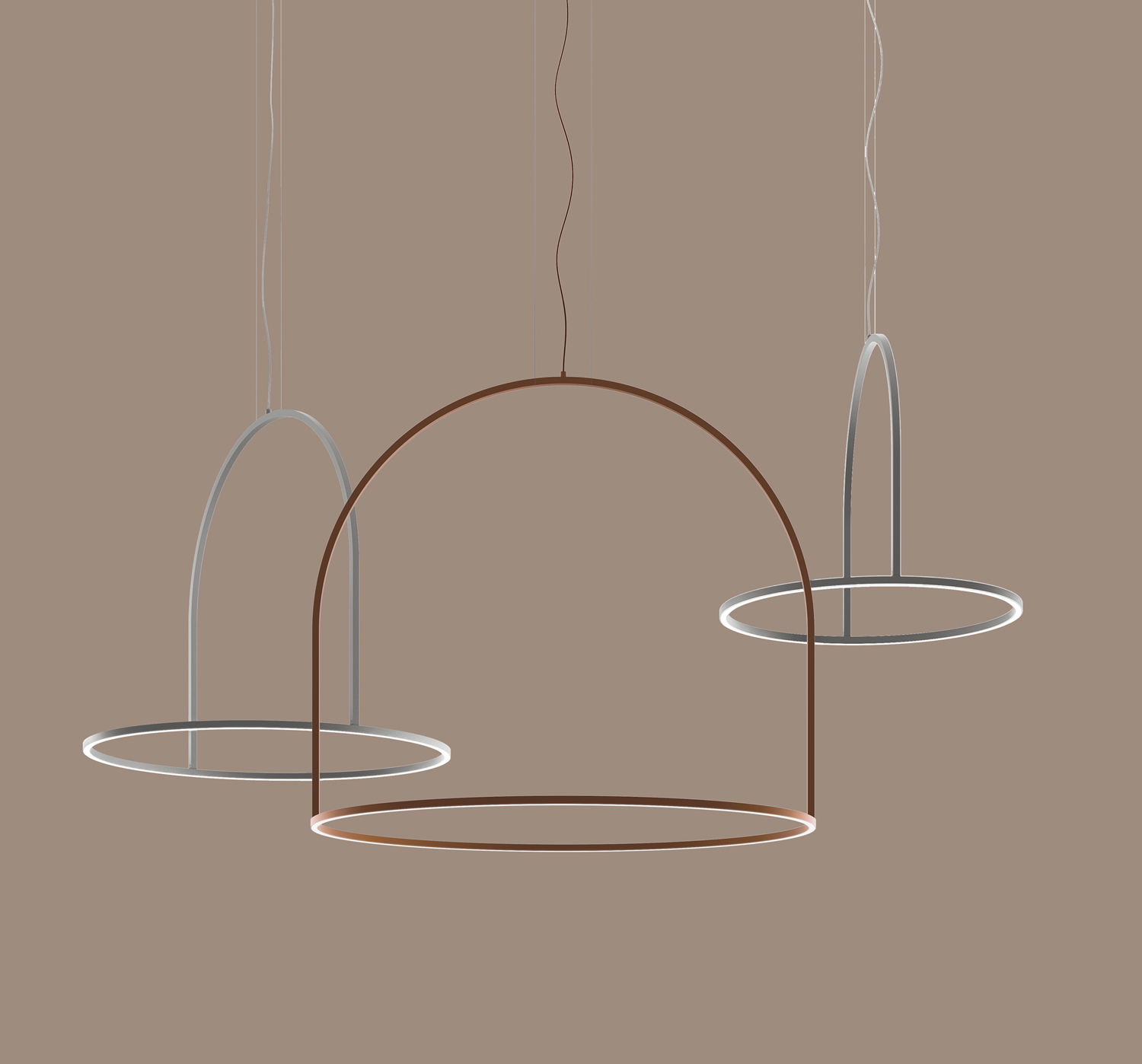 В коллекцию входят 3 светильника с диаметром кольца 90, 120 и 160см, а также доступными цветами: антрацитовый серый или кирпичный.