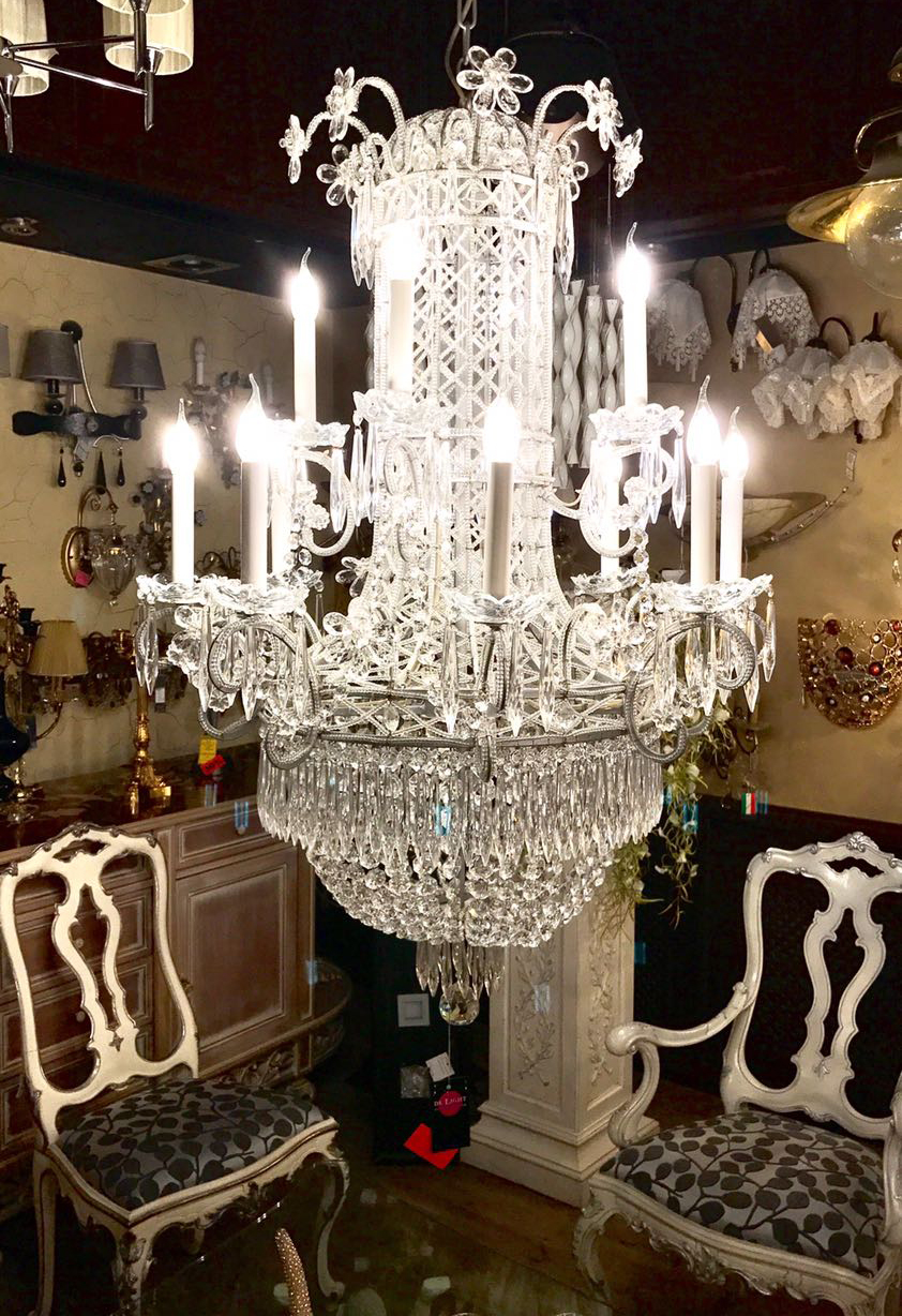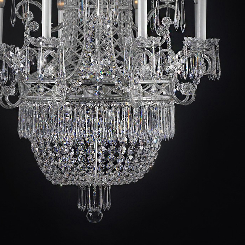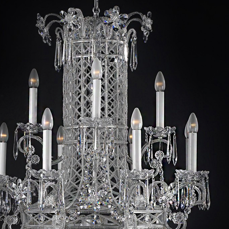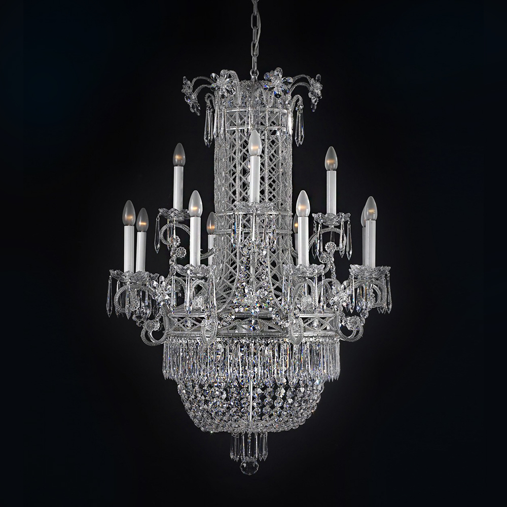 Люстра 12-ти рожковая на металлической арматуре серебряного цвета. Дизайн ламп выполнен в виде свечей в подсвечниках. Декор: прозрачные подвески и кулоны из хрусталя Asfour. Высота светильника регулируется за счет звеньев цепи.