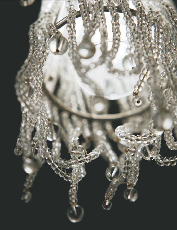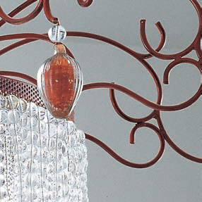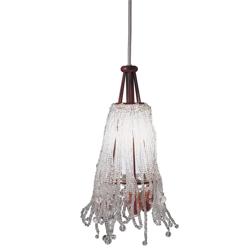 Подвесной светильник на металлической арматуре состаренного красного цвета. Плафон состоит из множества прозрачных стеклянных подвесок. Украшают светильник красные и прозрачные кулоны.