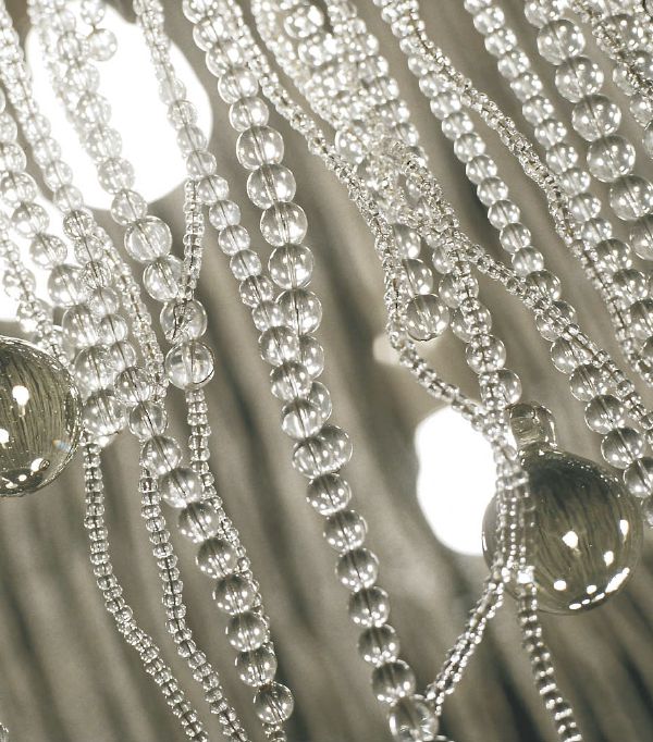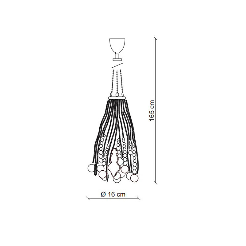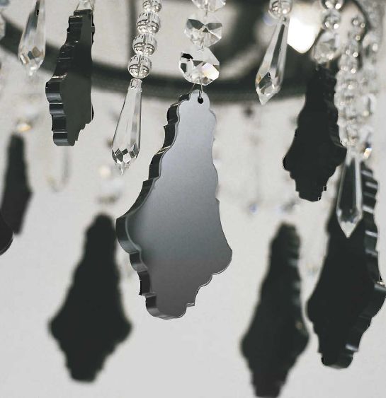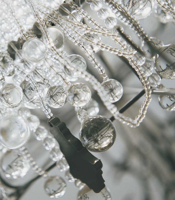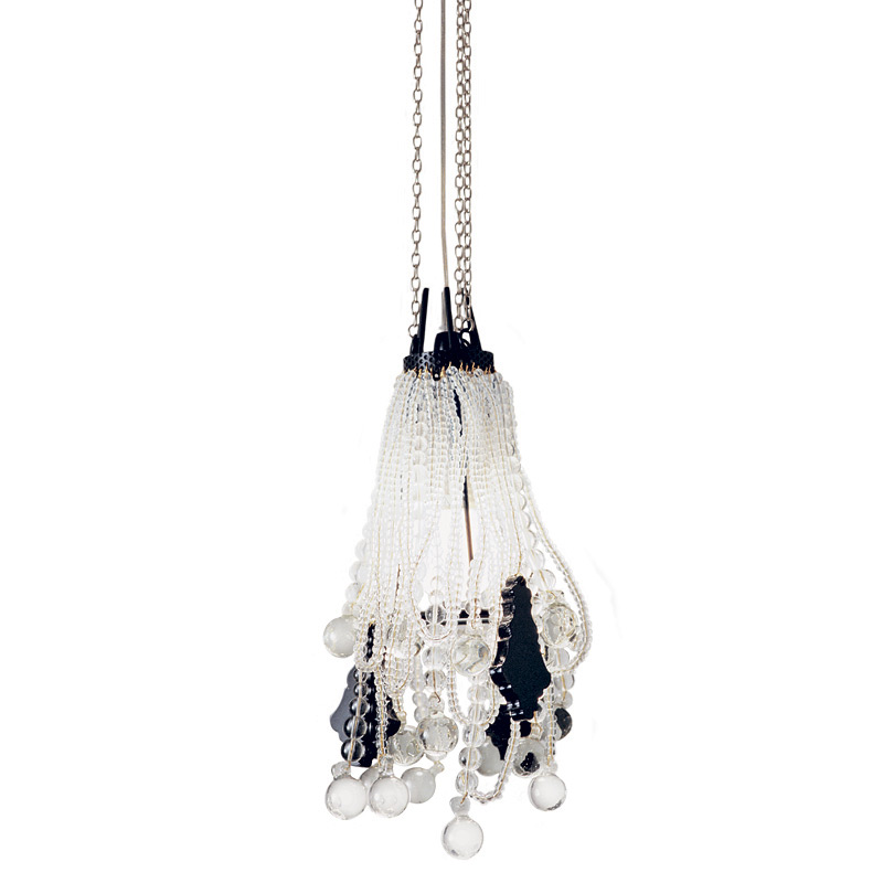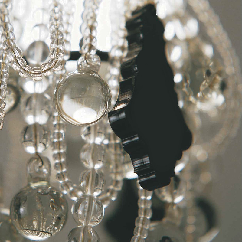 Подвесной светильник на металлической арматуре свинцового черного цвета. Плафон состоит из множества прозрачных стеклянных подвесок. Украшают светильник черные из метакрилата кулоны и прозрачные кулоны и кристаллы.