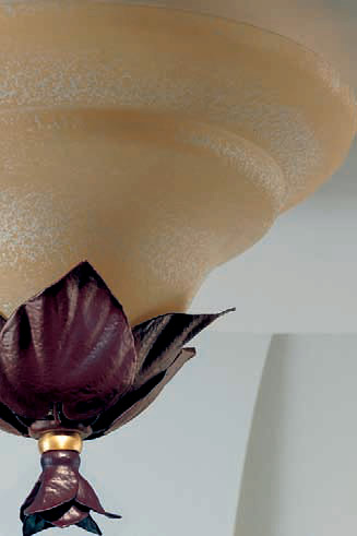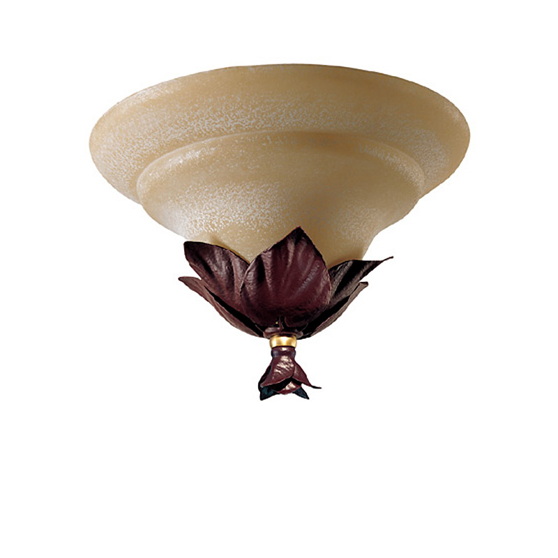 Потолочный светильник на арматуре из металла с эмалью красного цвета. Плафон выполнен из стекла бежевого цвета. Присутствуют элементы золотого цвета.