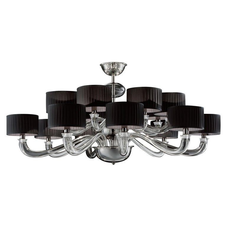 Люстра Barovier&Toso 5597/16 из коллекции Alexandria на арматуре прозрачного цвета, металлические части темно-хромированного цвета. Абажуры выполнены из ткани плиссе черного цвета. Отличительным знаком этой люстры является ее уменьшенная высота. Она подходит для освещения помещений, высота которых не позволяет использовать традиционную люстру. Муранское стекло ручной работы от лучших итальянских мастеров.