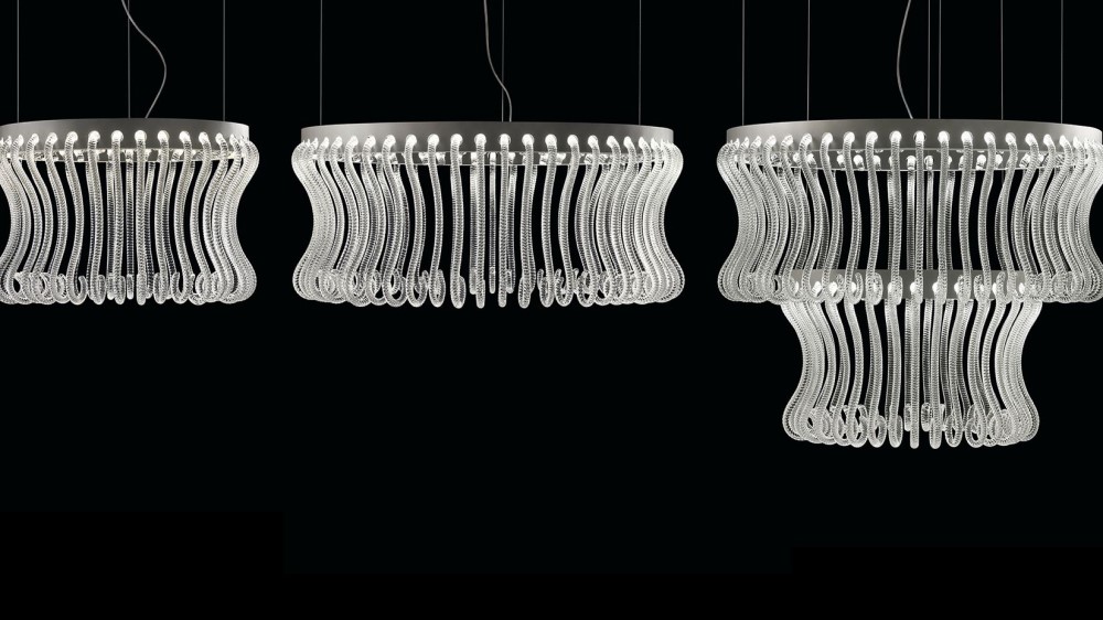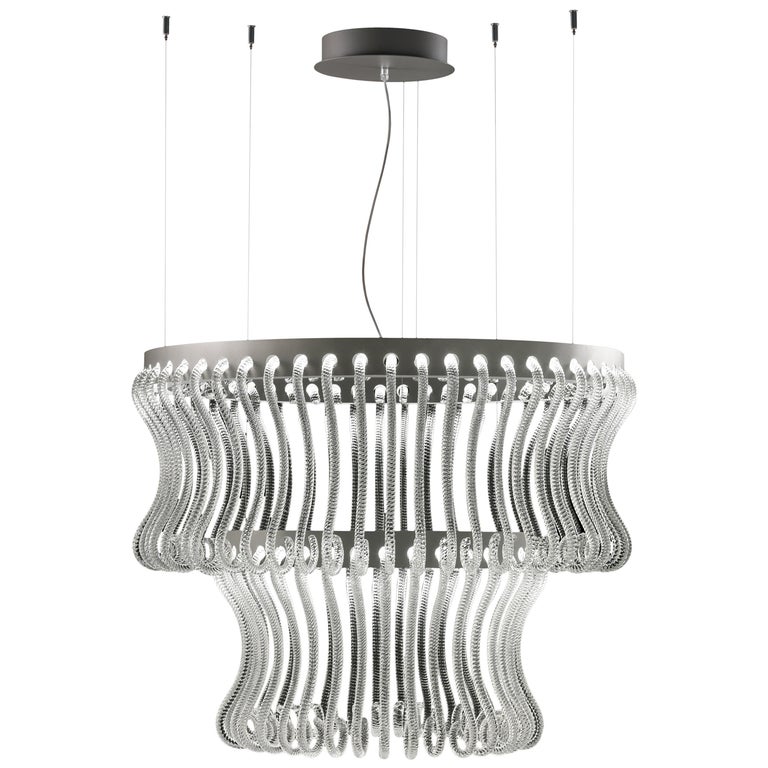 Подвесной светильник Barovier&Toso 7337 из коллекции Crown. Коллекция, которая подчеркивает одну из характерных черт люстр венецианской традиции. «Пастораль»- небольшой стержень, оканчивающийся спиралью. Сильно увеличенный и перевернутый этот стержень становится главным героем подвесных светильников с современным минималистичным дизайном. Доступен в трех различных конфигурациях (одно, двух или трехуровневый), двух цветах:прозрачный или золотой. Муранское стекло ручной работы от лучших итальянских мастеров. LED источник освещения (2 Strip Led 46W+73W).