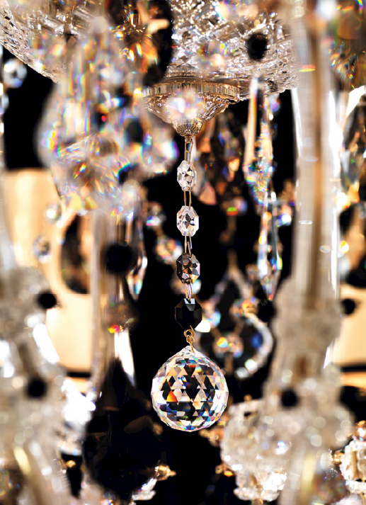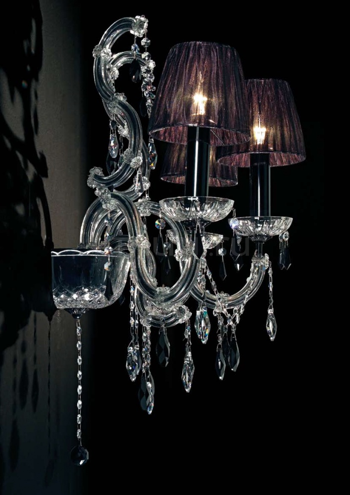 Трехрожковое бра из коллекции Beby Rose на основании из металла золотого цвета в стеклянном обрамлении. Золотой текстильный абажур скрывает лампу. Декор: прозрачные, янтарные и черные подвески из хрусталя Swarovski.