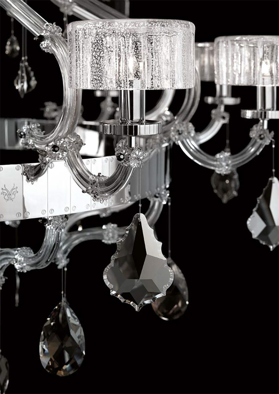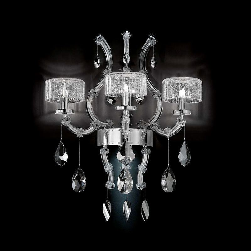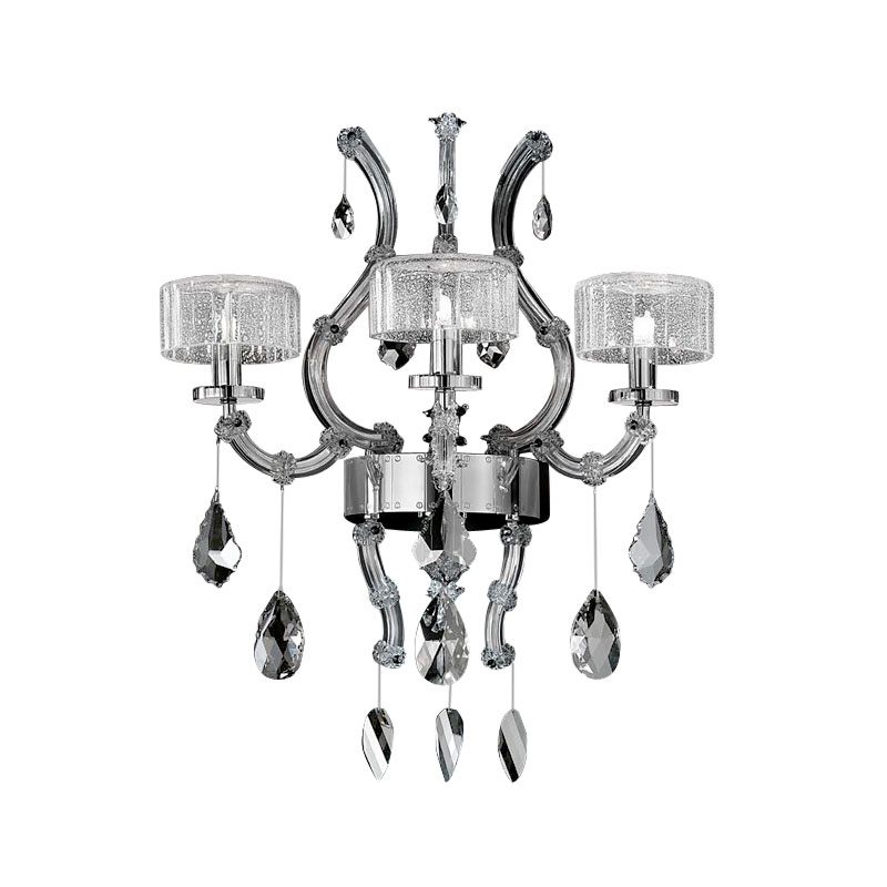 Бра 3-х рожковое из коллекции DIAMOND на арматуре из хромированного металла. Прозрачно-серебрянные плафоны из муранского стекла скрывают лампы. Декор: прозрачные подвески с кулонами из хрусталя Swarovski.