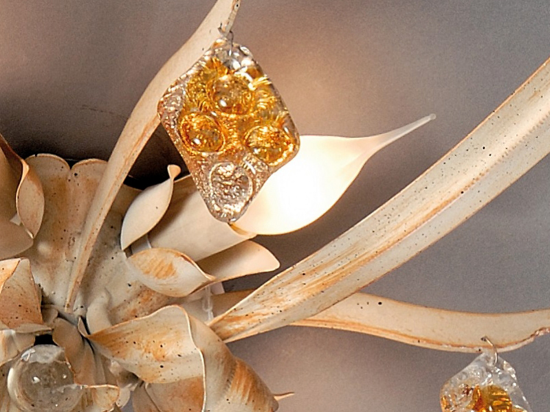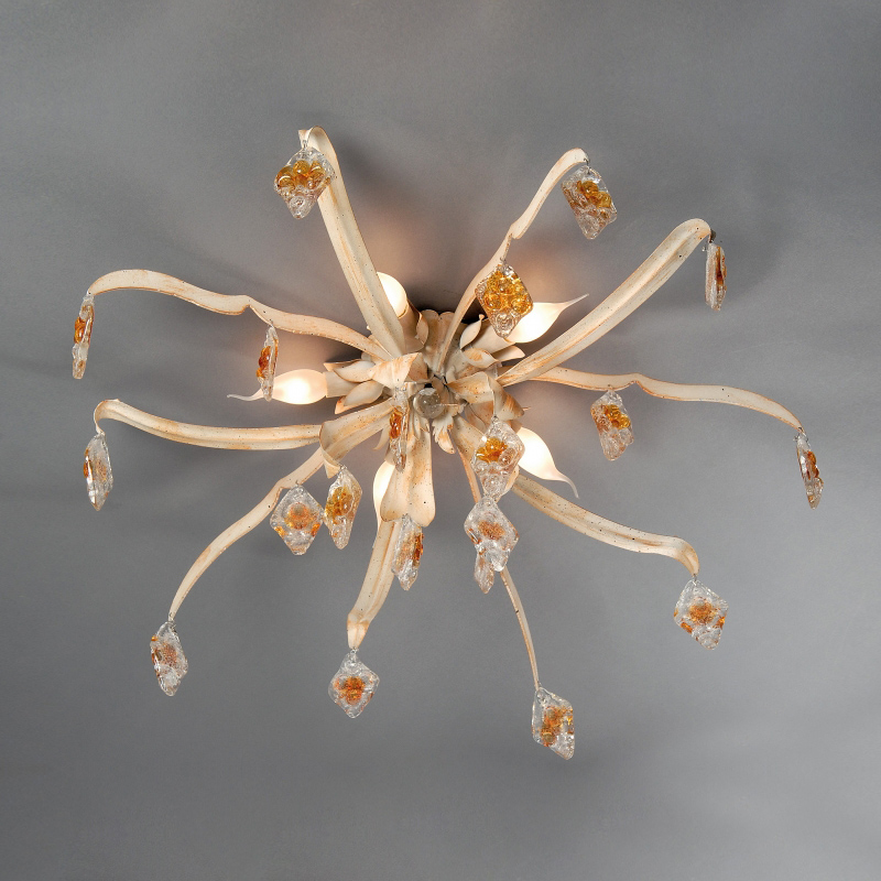 Потолочный светильник выполнен из металла с покрытием цвета слоновая кость с патиной. Кулоны из хрусталя прозрачно-янтарного цвета.