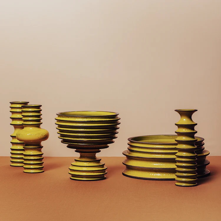 В коллекции Revolver последовательность спиралей разных размеров в тёплых тонах, таких как жёлтый и оранжевый, перемежается тонкими полосками коричневого ангоба, которые придают изделию особый шарм. Ангоб – это краска на основе глины, которая наносится на ещё необожжённую керамическую поверхность. Шероховатая поверхность получается благодаря наличию песчинок в ангобе.