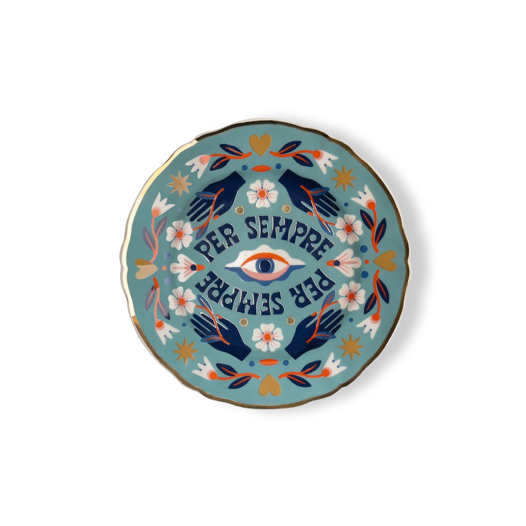 Десертная тарелка Bitossi Home Per Sempre d16.5 cm. Десертная тарелка Per Sempre («Навсегда») диаметром 16.5 см из коллекции Love Party —манифест вечных чувств, оформленный в эстетике современного таро и винтажных иллюстраций. В центре композиции — всевидящее око, окруженное нежными цветами, золотыми сердцами и оберегающими руками. Золотая кайма по краю придает изделию нотку аристократичности. Благодаря своему символизму, тарелка Per Sempre станет не просто украшением стола, но талисманом Вашего дома. Подходит для посудомоечной машины (не более 250-ти циклов), не подходит для микроволновой печи. Дизайн: Carmi Grau.