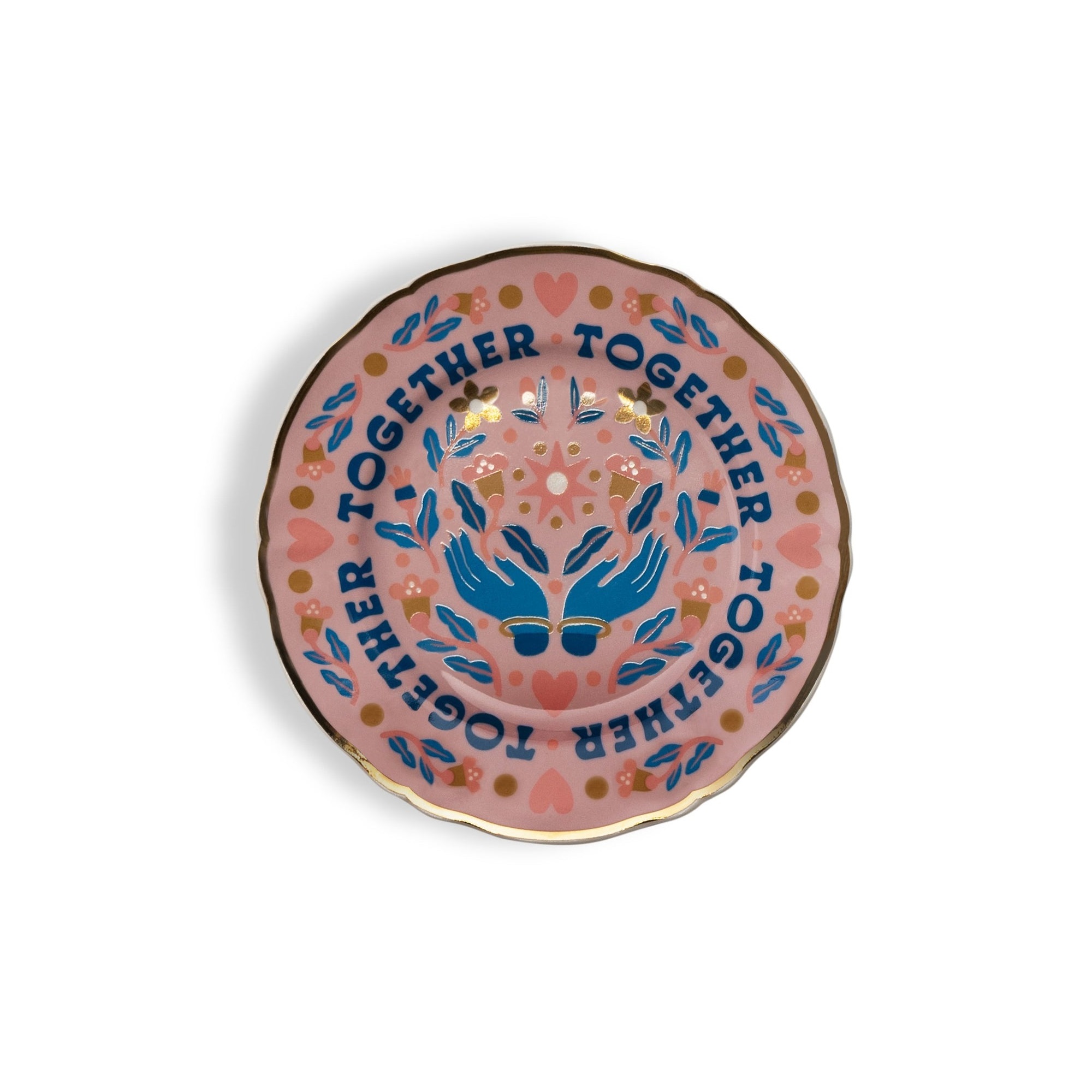 Десертная тарелка Bitossi Home Together d16.5 cm. Десертная тарелка диаметром 16.5 см приглашает к празднованию совместности и взаимности. Дизайн в эстетике современного таро и винтажных иллюстраций делает тарелку Together не просто интерьерным объектом, но настоящим талисманом. Насыщенная цветовая гамма и радиусный леттеринг создают особую гармонию с золотистой ноткой аристократизма. Подходит для посудомоечной машины (не более 250-ти циклов), не подходит для микроволновой печи. Дизайн: Carmi Grau.