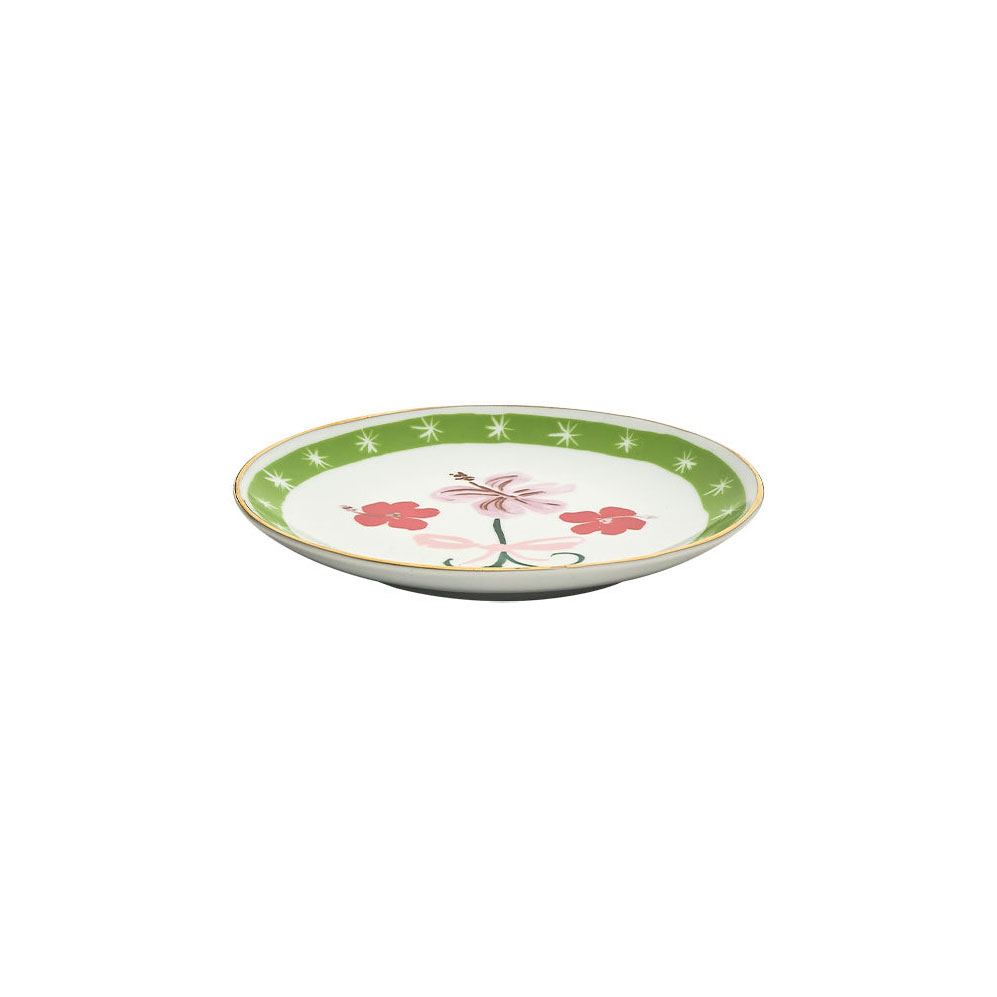 Фарфоровая десертная тарелка диаметром 16,5см с широкой зеленой и тонкой золотистой каймой и цветочным сюжетом. Подходит для посудомоечной машины (не более 250-ти циклов), не подходит для микроволновой печи. Дизайн: Chiara Perano.