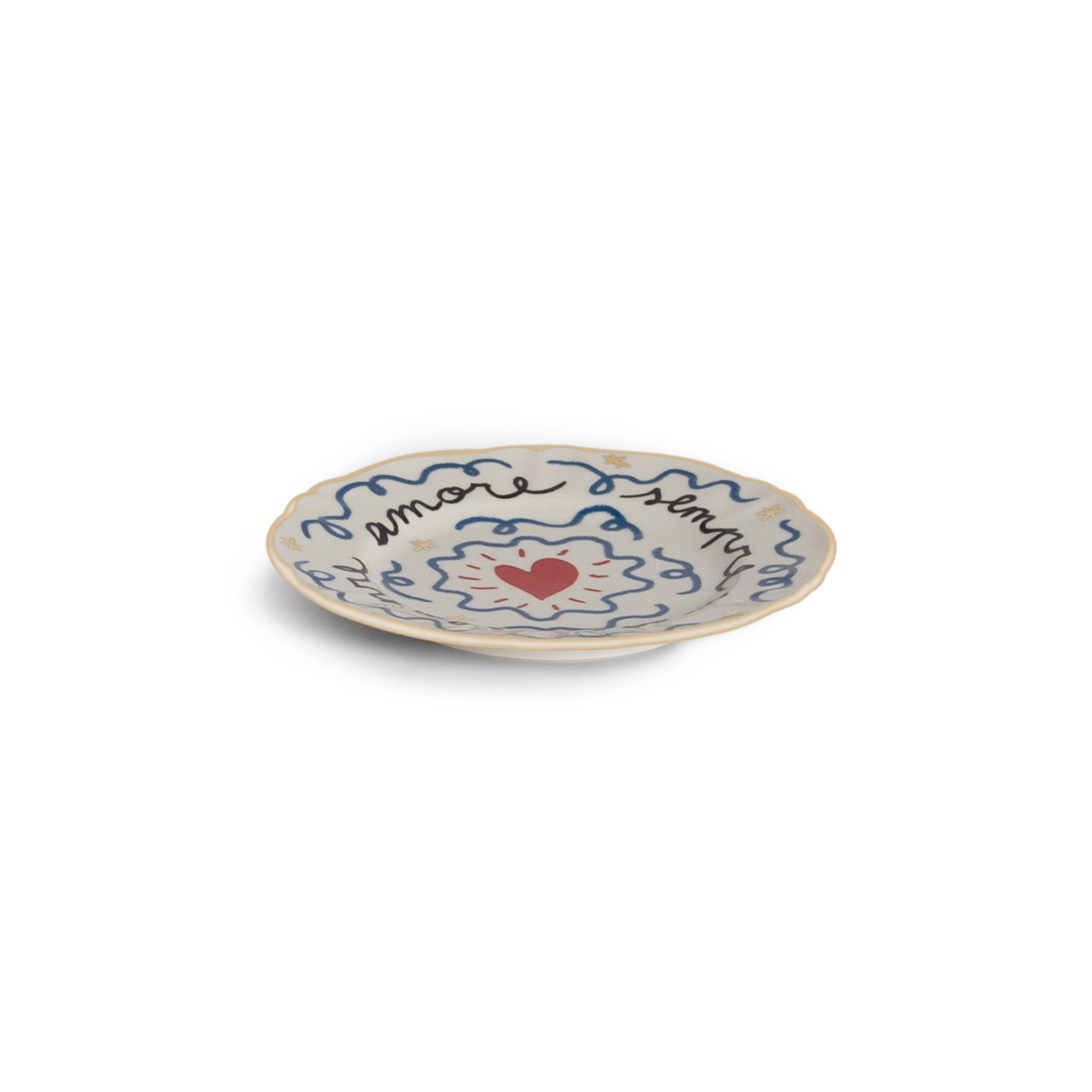 Фарфоровая десертная тарелка Cuore диаметром 16,5 см с цветным витиеватым узором, надписями и центральным рисунком красного сердца. Подходит для посудомоечной машины (не более 250-ти циклов), не подходит для микроволновой печи. Дизайн: Pangea.