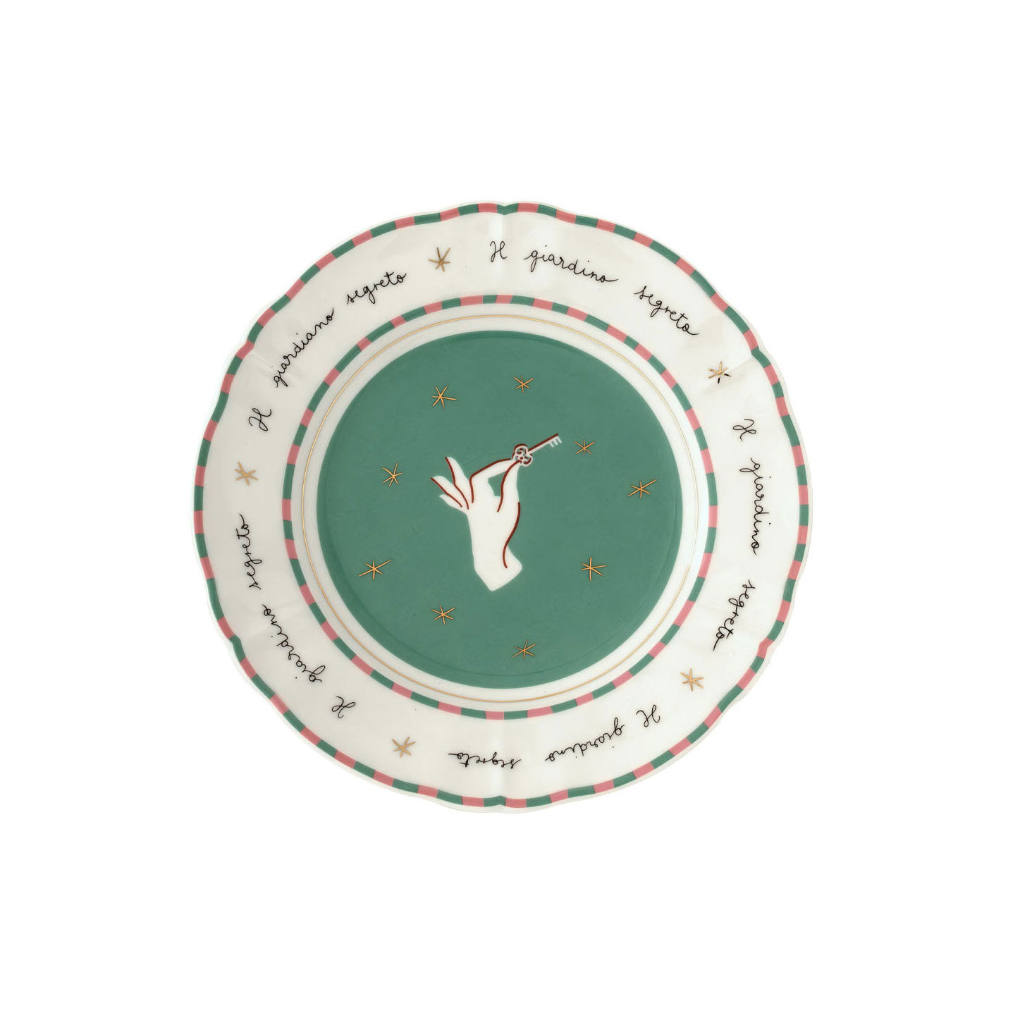 Фарфоровая десертная тарелка диаметром 20,5 см с символичным рисунком и подписями "Тайный сад". Подходит для посудомоечной машины (не более 250-ти циклов), не подходит для микроволновой печи. Дизайн: Pangea.