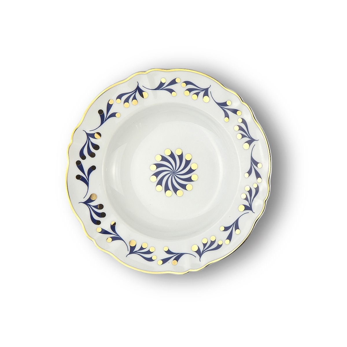 Глубокая тарелка Bitossi Home Marino. Суповая тарелка из белого фарфора Marine из коллекции «Abracadabra», диаметром 23 см. Золочение по круглому волнообразному краю, украшенному флорально-морским узором в сине-золотых тонах. По центру — лаконичный рисунок-ветрячок в сине-золотом цвете. Можно мыть в посудомоечной машине (не более 250 циклов), не подходит для использования в микроволновой печи. Дизайн: La Tigre – Luisa Milani and Walter Molteni.
