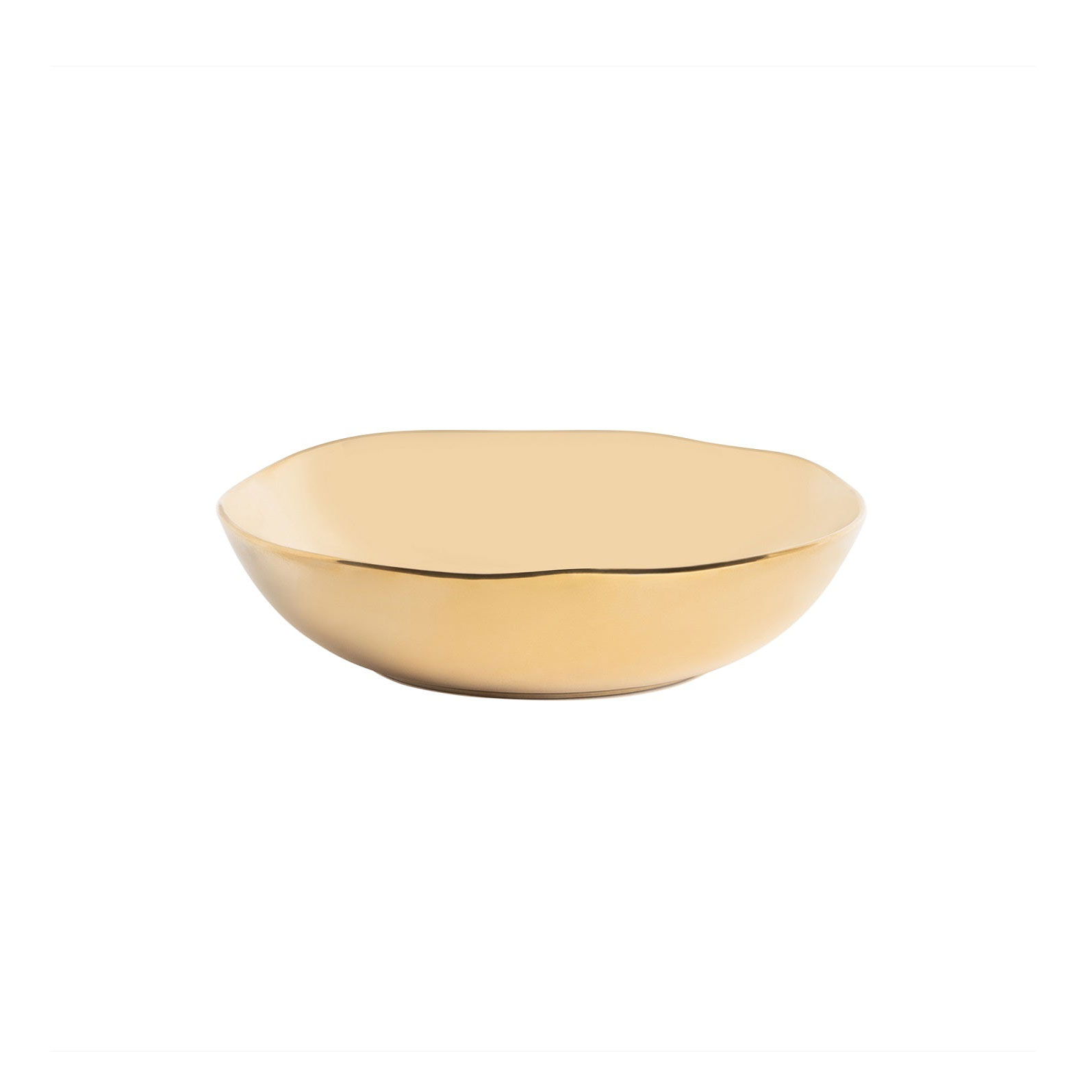 Фарфоровая глубокая тарелка высотой 5 см и диаметром 19 см в золотистой отделке с неровным краем. Подходит для посудомоечной машины (не более 250-ти циклов), не подходит для микроволновой печи.