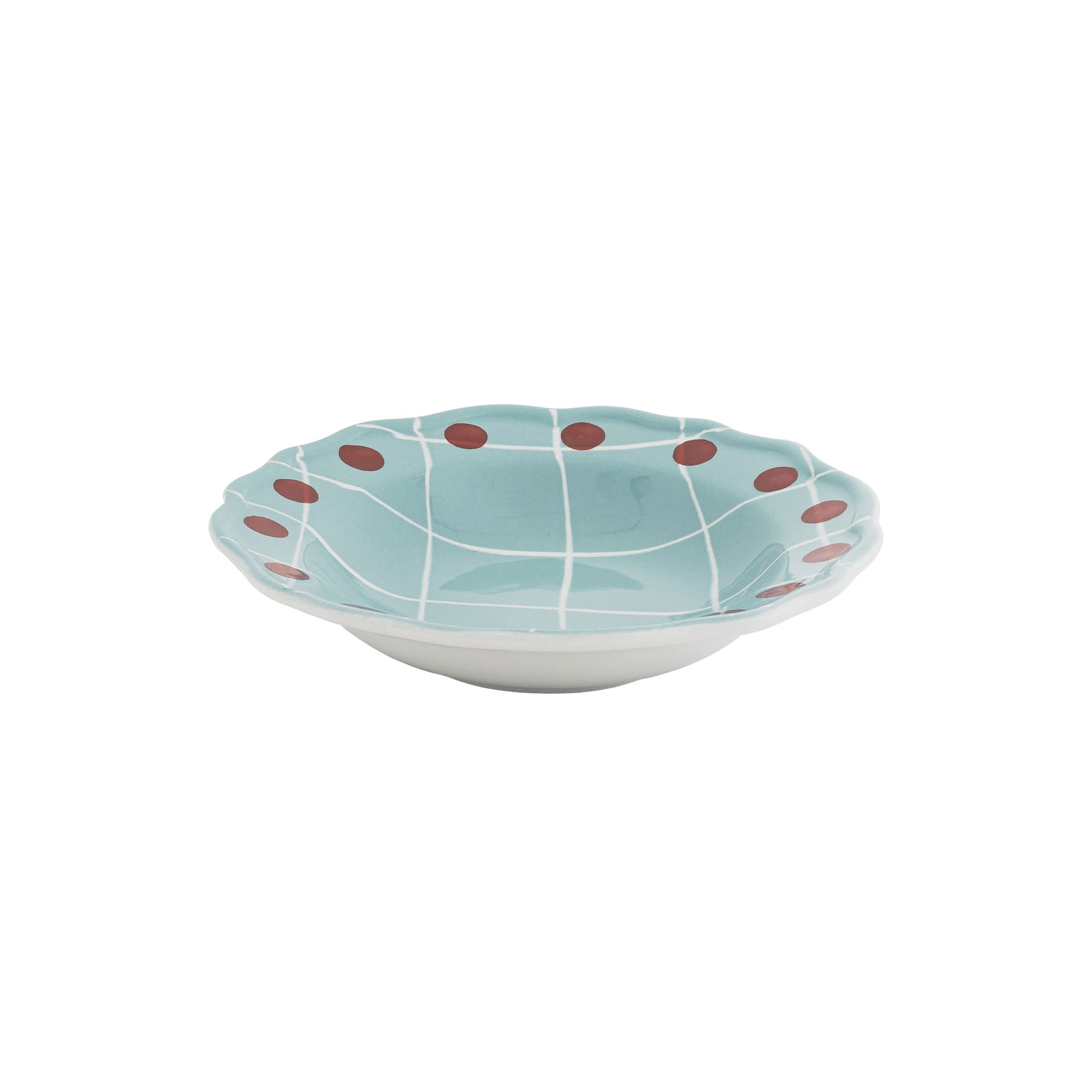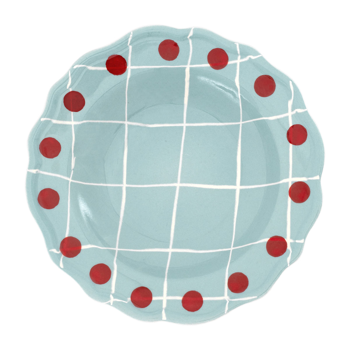 Глубокая керамическая тарелка 23 см приятного голубого оттенка в тонкую крупную белую сетку с радиусным точечным орнаментом красного цвета. Подходит для посудомоечной машины и микроволновой печи.