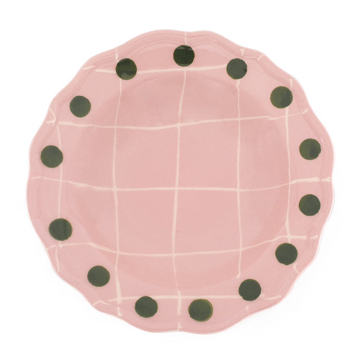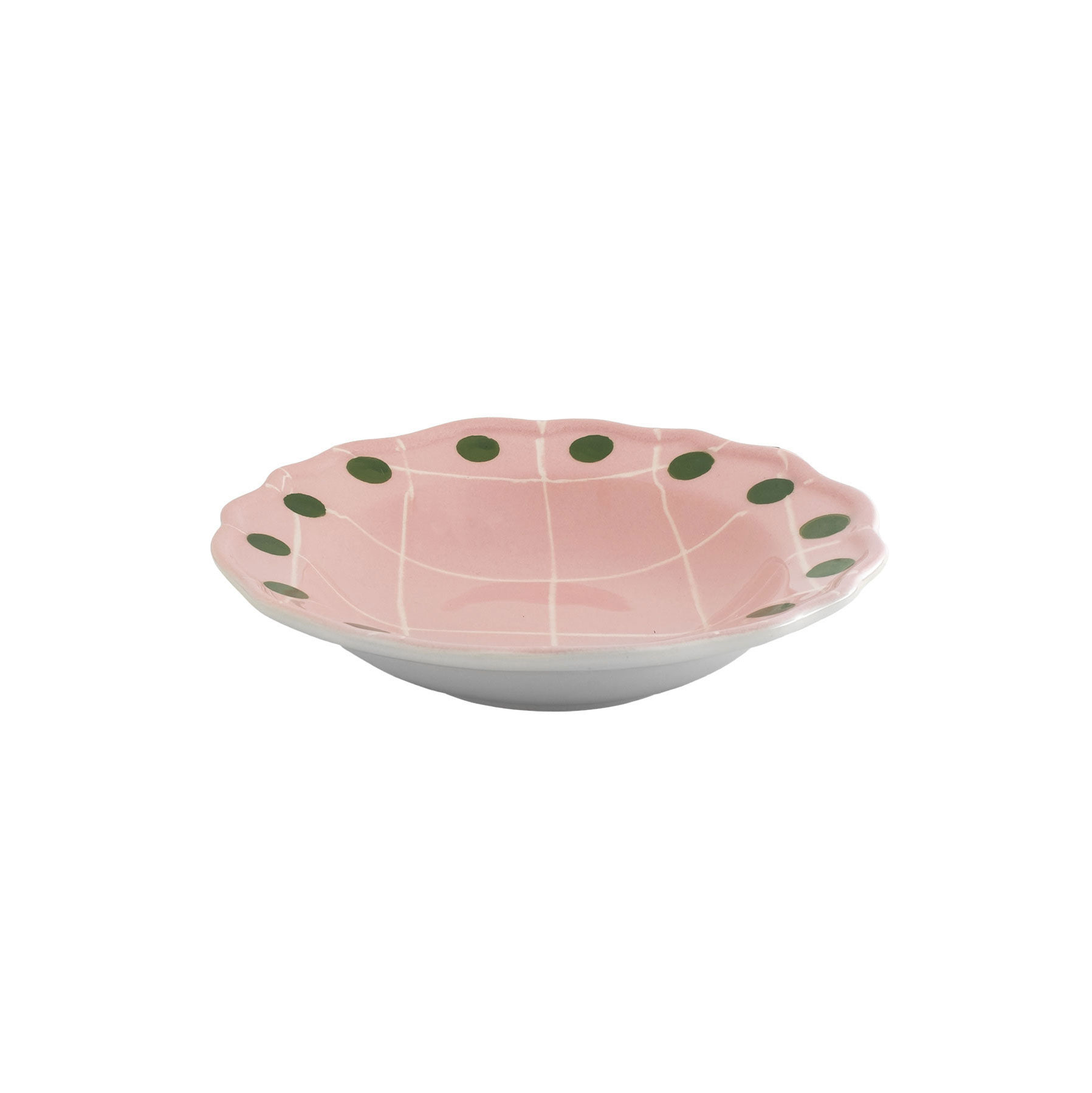 Глубокая керамическая тарелка диаметром 23 см розового цвета с тонкой белой сеткой и зелёным крапом по краю. Подходит для посудомоечной машины (не более 250-ти циклов) и для микроволновой печи.