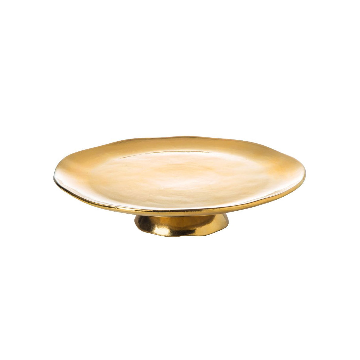 Фарфоровая подставка под торт высотой 6 см и диаметром 30,5 см с золотистой отделкой и неровными краями с эффектом ручной лепки. Подходит для посудомоечной машины (не более 250-ти циклов), не подходит для микроволновой печи.