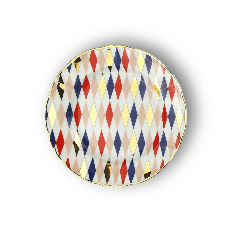 Десертная тарелка Quadri из коллекции Abracadabra. Фарфоровая десертная тарелка с цветной деколью и золотыми деталями. Подходит для посудомоечной машины до 250 циклов, не подходит для микроволновой печи. Диаметр 20,5 см. Дизайн: La Tigre.